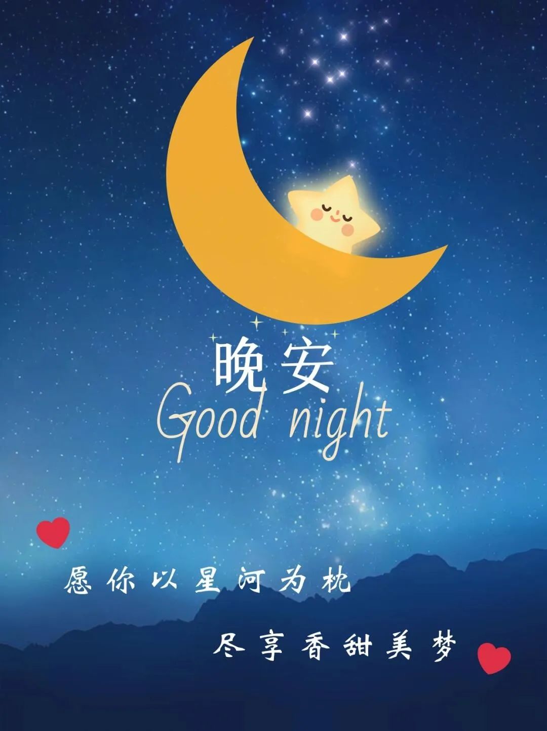 夕阳余晖洒下,星光微笑闪耀,月光代表思念,静静送上祝福。希望你抛开压力烦恼,迎接幸福快乐,祝你脸色好,睡眠好,好运好梦好心情,好梦甜蜜,晚安!