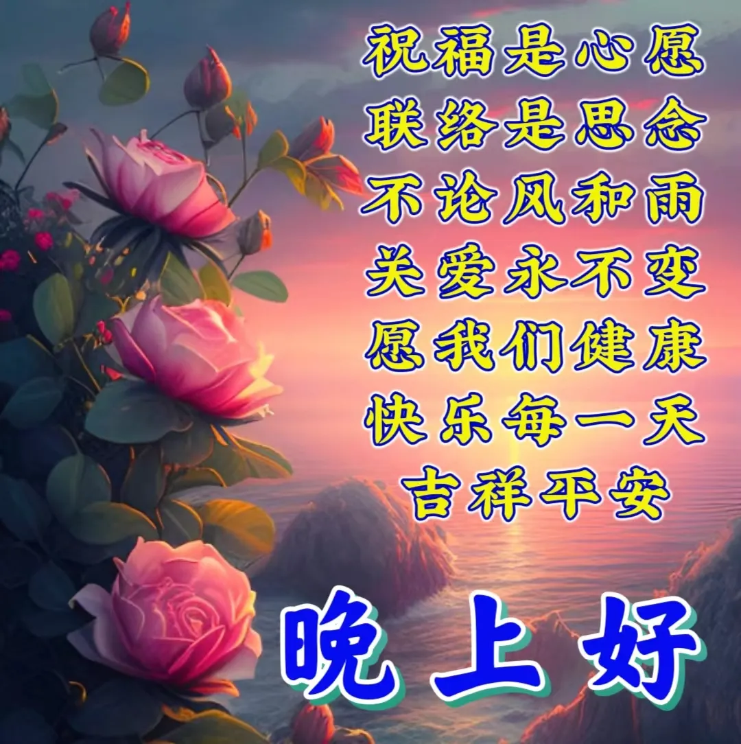 晚上好,长夜漫漫,清风是我的笑颜;灯光闪闪,霓虹是我的思念;祝福连连,问候是我的祝愿,愿这唯美夜晚让你收获好运财运福运,晚安!