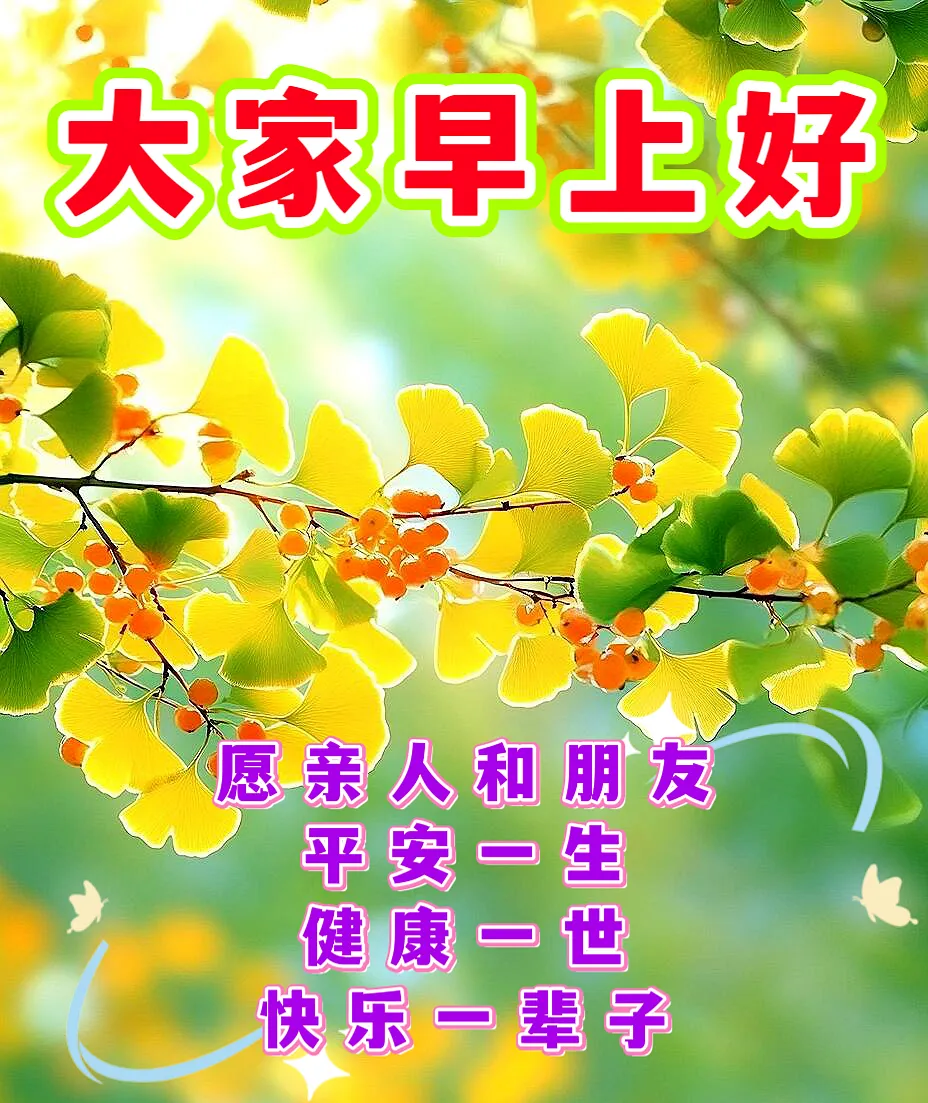 季节悄然流转,风景不停变换。银杏初黄,晕染岁月画卷;记忆之舟,驶过时光之海;思念之花,点缀流年之窗。愿朝夕皆如意,四季皆平安。早安! The seasons quietly flow, and the scenery keeps changing. Ginkgo biloba turns yellow, blending with the painting of time; The boat of memory sails through the sea of time; The flower of longing adorns the window of time. May everything go smoothly day and night, and may all seasons be peaceful. good morning! 愿你一生努力,一生被爱,想要的都拥有,得不到的都释怀,愿你如阳光,明媚不忧伤。早安! May you work hard all your life, be loved all your life, have everything you want, and let go of everything you can't get. May you be like sunshine, bright and not sad. good morning!