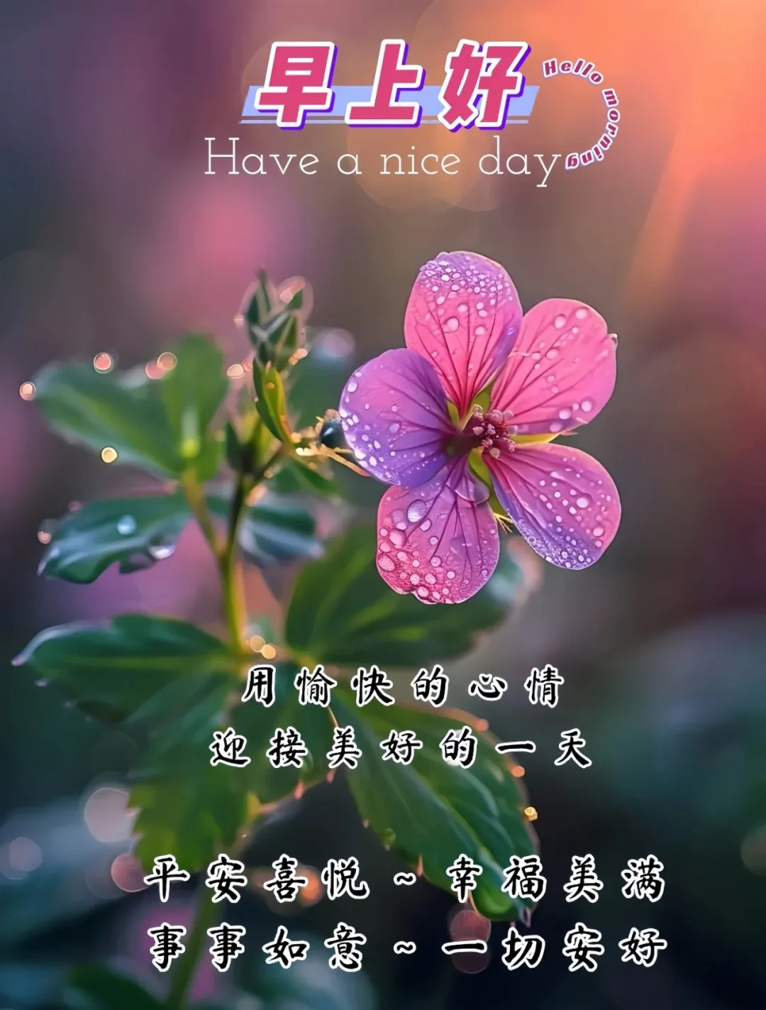 晨光洒满窗前面,友谊如花开展。祝福送上你身边,快乐时刻不停。愿你每天忙碌中找到片刻安宁。早上好,美好生活与你相随。 The morning light shines in front of the window, and friendship unfolds like flowers. Blessings are sent to you, and happiness never stops. May you find a moment of peace amidst your busy schedule every day. Good morning, a beautiful life is with you. 每天清晨睁开眼,就要对自己说:“今天是最美好的一天!”不要让昨天的烦恼影响到今天的好心情。面朝阳光,努力向上,相信日子会变得单纯而美好。早安! Every morning when you open your eyes, you should say to yourself, 'Today is the most beautiful day!' Don't let yesterday's troubles affect today's good mood. Facing the sunshine, striving upwards, believing that life will become simple and beautiful. good morning!