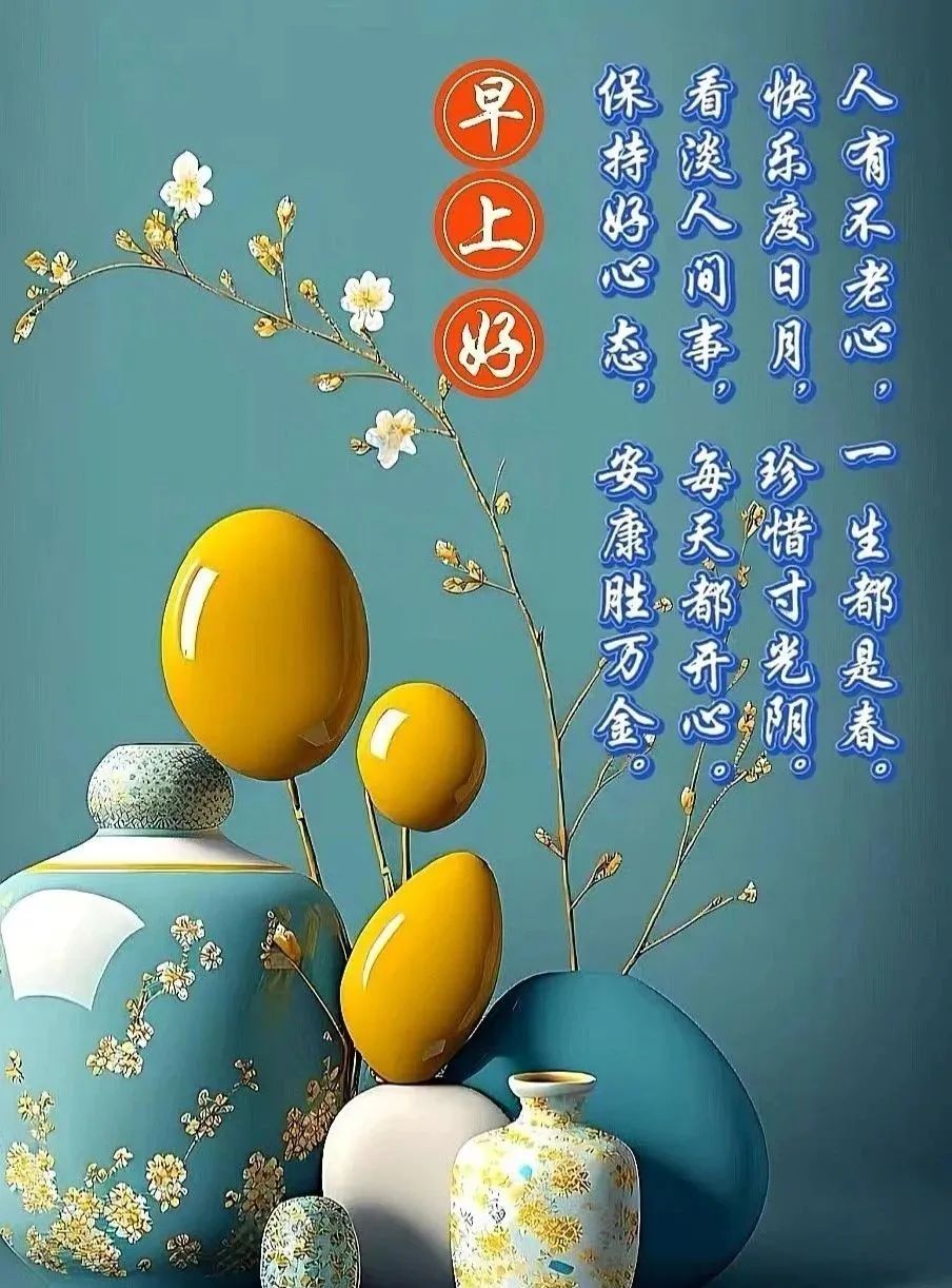不是每个人都能成为自己想要的样子,但每个人都可以努力成为自己想要的样子。早安! Not everyone can become the person they want to be, but everyone can strive to become the person they want to be. good morning! 日月伴人老,情谊比山高!虽然相见少,心中忘不了!每天一清早,相互来问好!短短两三语,浓浓心意到。早上好! Sun and moon accompany people in their old age, friendship is higher than mountains! Although we rarely see each other, I can't forget it in my heart! Every morning, greet each other! In just two or three words, a strong heart was conveyed. Good morning