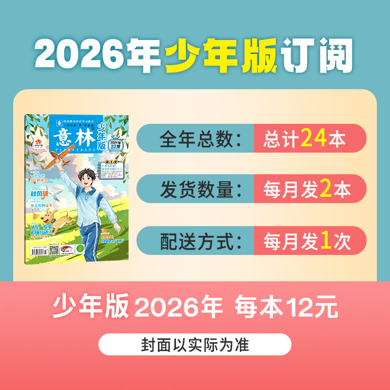 意林旗舰店推出的《意林·少年版》2024年7-12月半年订阅,专为中小学生量身打造,是一本集课外阅读、阅读理解与励志成长于一体的有声杂志。内容精选贴近青少年生活的趣味故事、哲理短文与成长案例,语言生动,寓教于乐,助力提升阅读能力与写作水平。每期配有专业朗读音频,支持听读结合,培养语感与专注力。2025年及2026年订阅用户还可享受内容升级与专属活动福利。作为深受师生家长信赖的品牌,《意林·少年版》不仅是课外阅读的优质选择,更是激发梦想、塑造品格的精神伙伴,陪伴少年在阅读中收获智慧与力量。