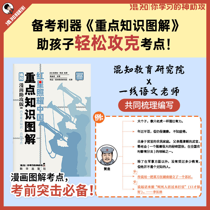 【混知官方】全新推出漫画助攻版《红星照耀中国》,现货热销中!本书由“混子哥”陈磊领衔创作,以生动有趣的漫画形式还原埃德加·斯诺笔下的经典纪实作品,将厚重的历史变得轻松易懂。边画边讲,图文并茂,帮助初中生、高中生快速掌握名著核心内容与考点,轻松应对考试。不仅还原了红军长征、革命领袖风采等关键情节,更融入现代视角解读,让红色经典不再枯燥。既是爱国教育的好教材,也是提升阅读兴趣的优质读物。用漫画读懂经典,让历史“活”起来,一书在手,考点全有!