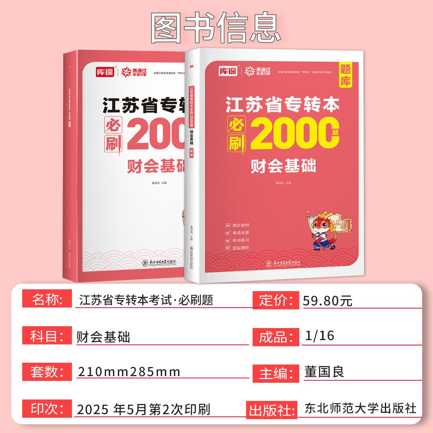 《库课2026江苏专转本财会基础必刷2000题》是专为江苏五年一贯制专转本财经类考生打造的权威复习资料。本书紧扣江苏省统招专转本考试大纲,聚焦财会专业综合基础理论,精选2000道高质量习题,涵盖会计基础、财务管理、财经法规等核心考点。题目类型全面,难易梯度合理,注重基础知识巩固与解题能力提升。每道题均配有详细解析,帮助考生理解考点、掌握答题技巧。适用于系统复习、强化训练与考前冲刺,是江苏专转本财经类考生提升成绩、成功上岸的必备习题集,助力考生高效备考,圆梦本科。