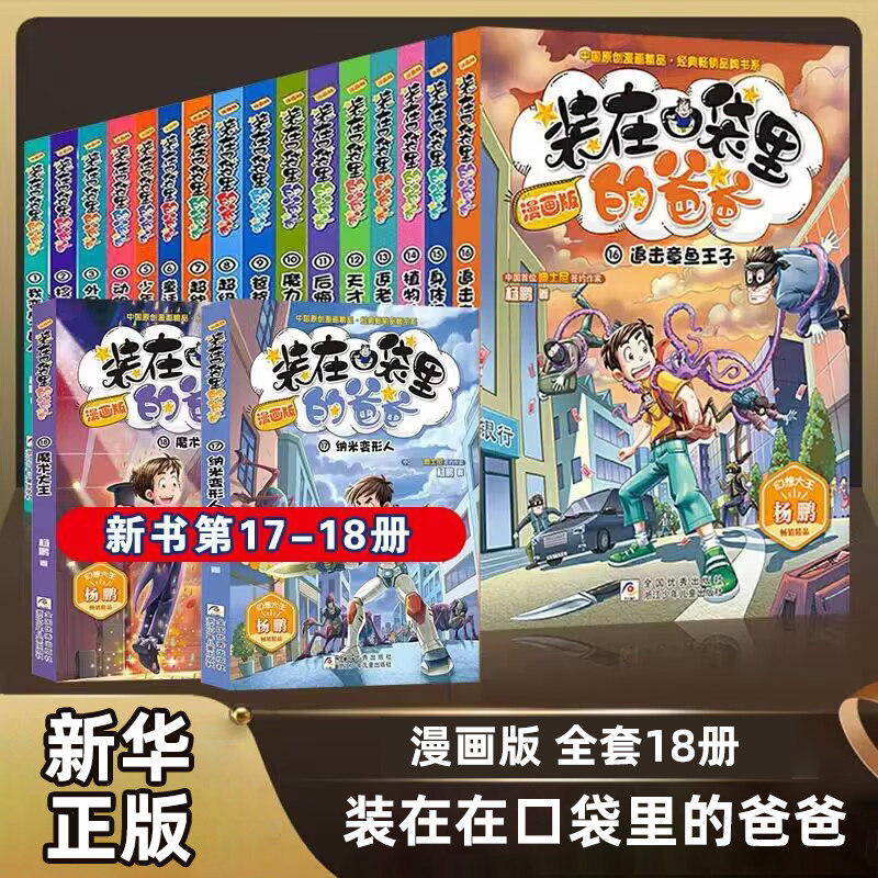 《装在口袋里的爸爸》漫画版全套1-22是“幻想大王”杨鹏创作的经典科幻童话系列,以天马行空的想象力和幽默风趣的笔触,讲述小男孩杨歌与他只有拇指大小、却充满奇思妙想的科学家爸爸共同经历的奇幻冒险。因一场意外,爸爸变成了巴掌大小,从此住在杨歌的口袋里,用发明帮助儿子解决难题,也闹出不少笑话。漫画版将原著精彩情节视觉化,画面生动,节奏明快,适合青少年阅读。全套22册涵盖变身、时空穿越、机器人、环保等多元主题,既富有童趣,又蕴含科学知识与人生哲理,是激发想象力与阅读兴趣的优秀读物,深受小读者喜爱。