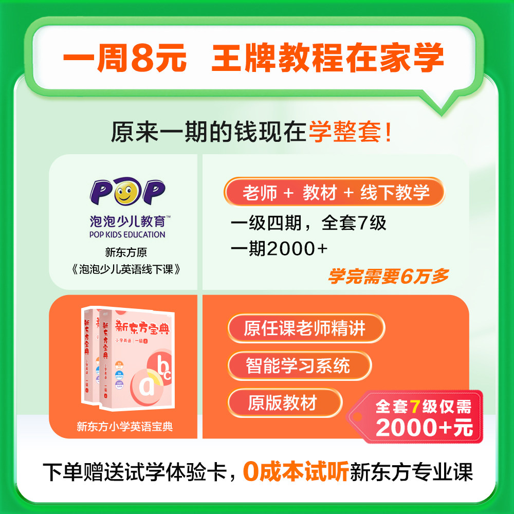【新东方旗舰】新东方宝典小学英语系列,专为1-6年级学生打造,是新东方泡泡少儿英语精心研发的课外辅导资料。该套资料覆盖小学全阶段,适合0基础学生系统学习英语,内容紧贴课标,融合趣味互动与科学方法,帮助孩子在听、说、读、写各方面稳步提升。搭配“新东方课堂”云书平台,实现线上线下同步学习,随时随地巩固知识。礼盒装设计,包含分级教材、练习册、音频资源及学习卡片,寓教于乐,激发孩子学习兴趣。新东方凭借多年教学经验,助力小学生轻松掌握英语核心能力,为未来学习打下坚实基础。