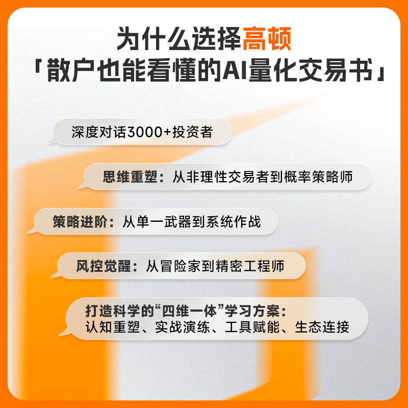 【官方现货】《高顿散户也能看懂的AI量化交易书》专为零基础小白打造,融合前沿AI技术与实战量化策略,让普通投资者轻松掌握智能交易精髓。本书由专业团队编写,内容通俗易懂,涵盖股市、基金等理财场景,搭配1V1专属指导服务,帮助读者快速上手。更有模拟实操系统,真实还原交易环境,边学边练,降低试错成本。无论你是投资新手还是希望进阶的散户,都能通过本书建立科学交易体系,提升决策效率与收益稳定性。官方正版现货发售,即买即学,开启你的智能理财新旅程!