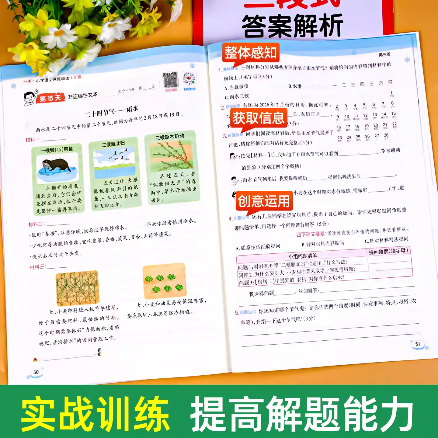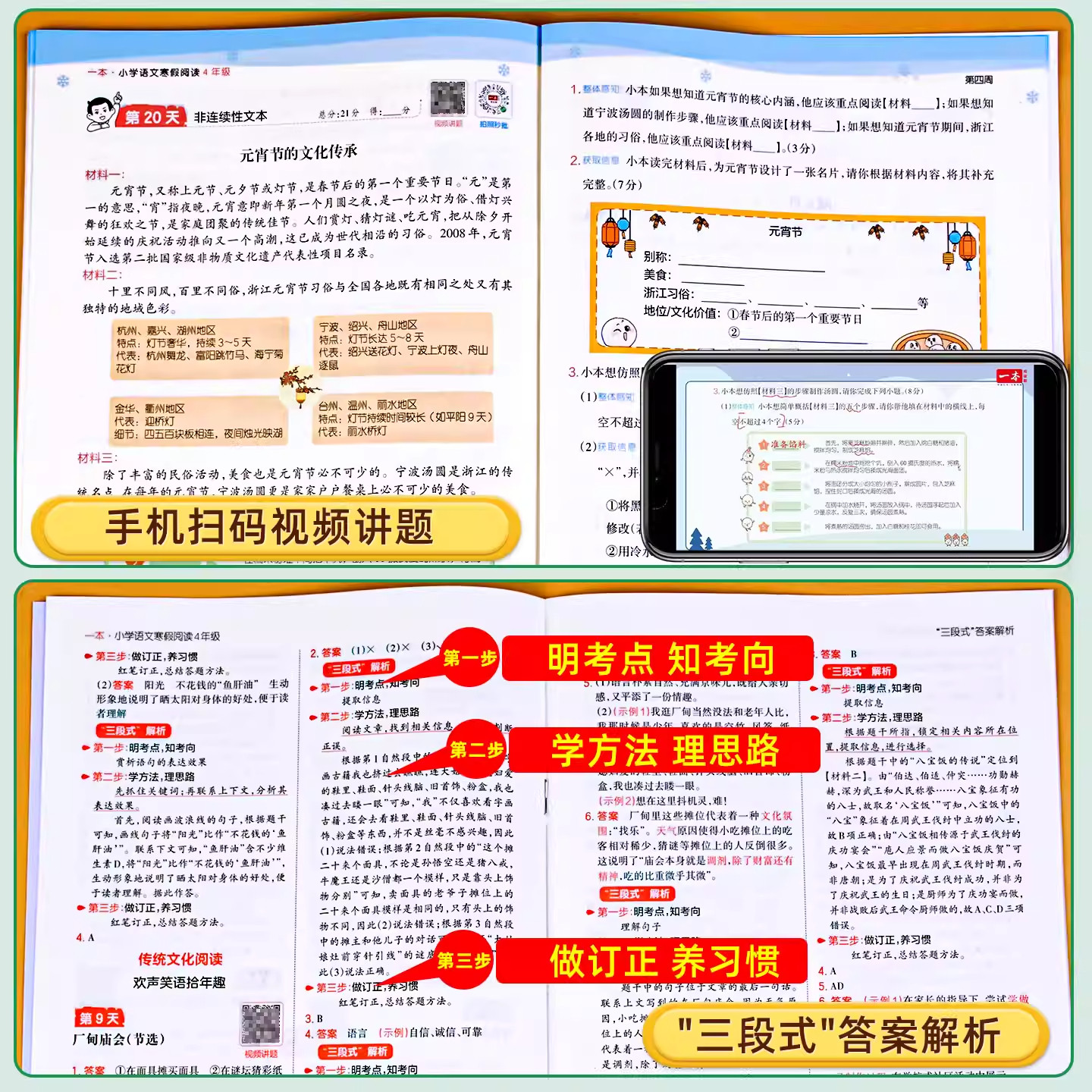这本《四年级寒假阅读语文阅读理解专项训练》与人教版教材同步,专为小学四年级学生寒假设计,旨在巩固课内知识、提升阅读理解能力。全书紧扣教材单元主题,精选贴近学生生活的短文,涵盖写人、记事、状物、写景等多种文体,题型丰富,包括词语理解、句子赏析、内容概括和主旨把握等。每日一练的形式帮助学生养成持续阅读习惯,难度循序渐进,兼顾基础与拓展。配有详细答案解析,便于家长辅导或学生自查。通过系统训练,有效衔接下学期学习,夯实语文基础,提升阅读素养,是寒假语文学习的理想辅助用书。