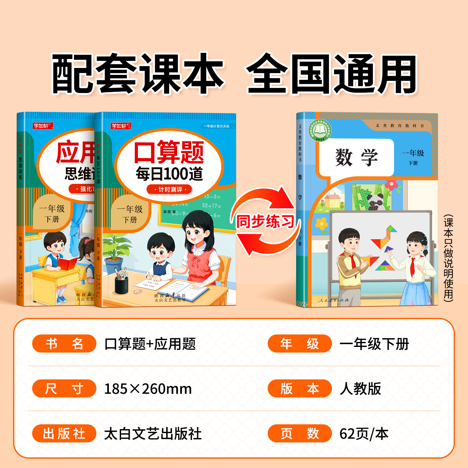《一年级下册数学口算应用题天天练》(人教版同步)专为1年级下学期学生设计,紧扣教材内容,聚焦100以内加减法的专项训练。本书包含每日口算题卡与应用题练习,题型丰富、难度适中,注重计算能力与数学思维的双重提升。通过“每日一练”的形式,帮助孩子巩固课堂知识,提高运算速度和准确性,同时培养解决实际问题的能力。题目编排科学,循序渐进,配有清晰答案,便于家长辅导与自我检测。是提升一年级学生数学基础、夯实计算功底的优质练习本,助力孩子轻松应对学期学习任务。