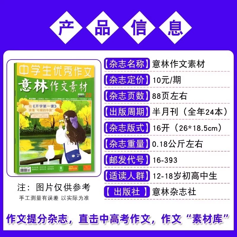 《意林作文素材》杂志2026年1/2月1-3期全新上市,专为初中生、高中生及高考考生打造,精选热点时事、经典人物、哲理故事与高分范文,助力写作能力提升。本期内容紧扣新课标与高考命题趋势,提供实用素材与写作技巧,兼具思想性与可读性。同时提供全年/半年订阅服务,另有2025年1-12月过刊可选,非合订本设计,便于翻阅与收藏。作为《读者》《青年文摘》同类优质读物,《意林作文素材》以短小精悍、贴近生活的风格,成为学生课外阅读与备考的得力助手,是积累素材、拓宽视野的理想选择。