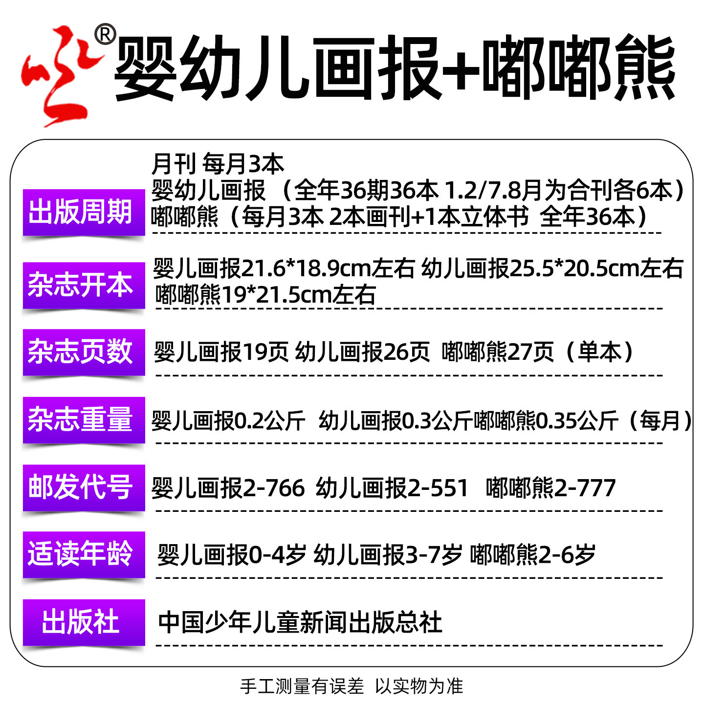 2026年1-12月全年订阅现货发售!《幼儿画报》《婴儿画报》《嘟嘟熊》杂志专为3-7岁儿童打造,内容涵盖故事、认知、习惯培养与趣味互动,图文并茂,寓教于乐。同期推出《东方娃娃》《小聪仔科普》等优质绘本过刊,科学启蒙与艺术审美并重。现订阅即赠精美留声机或拆拆乐玩具,激发孩子探索兴趣。所有刊物按月寄送,品质保证,助力幼儿语言、思维与情感全面发展。适合家庭亲子共读,是陪伴孩子成长的理想选择。限时优惠,数量有限,欢迎抢购!