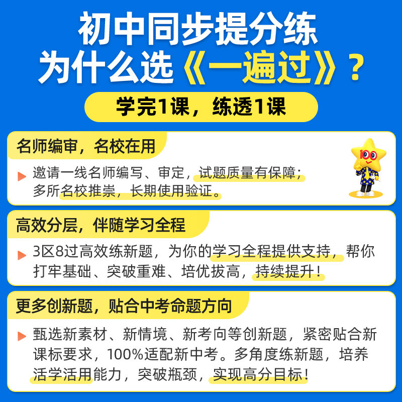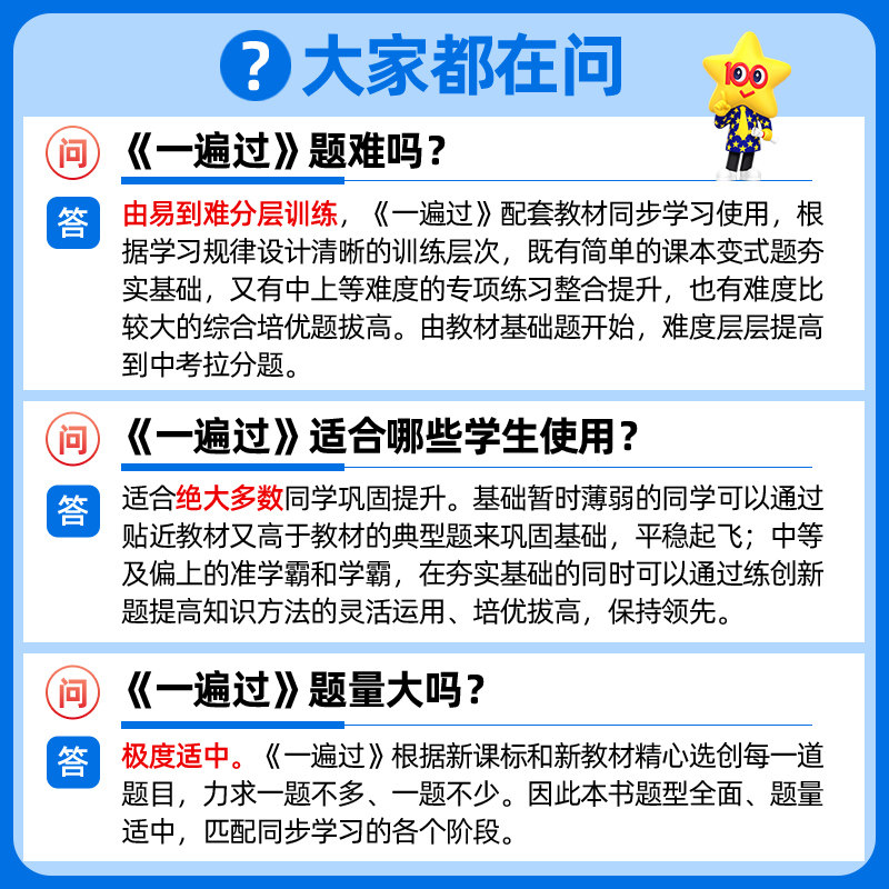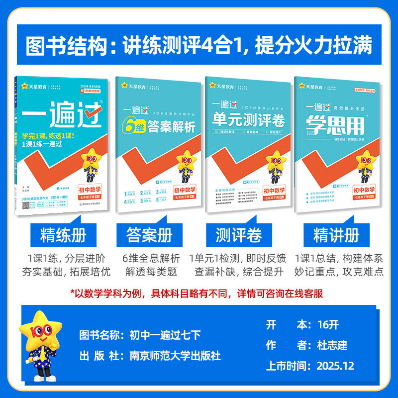《2026春初中一遍过》是一套专为七年级至九年级学生设计的同步训练教辅资料,涵盖语文、数学、英语、物理、化学、道德与法治、历史、地理、生物等全学科,适配人教版和北师大版教材。丛书按学期分册,内容紧扣新课标,同步课堂教学进度,注重基础知识巩固与能力提升相结合。每册包含课时练习、单元检测和综合复习,题型多样,难度梯度合理,帮助学生夯实基础、突破重难点。答案详解清晰,便于自主学习与查漏补缺。无论是日常练习还是考前复习,《一遍过》都是初中生高效学习的得力助手,助力学生稳步提升成绩,轻松应对中考。