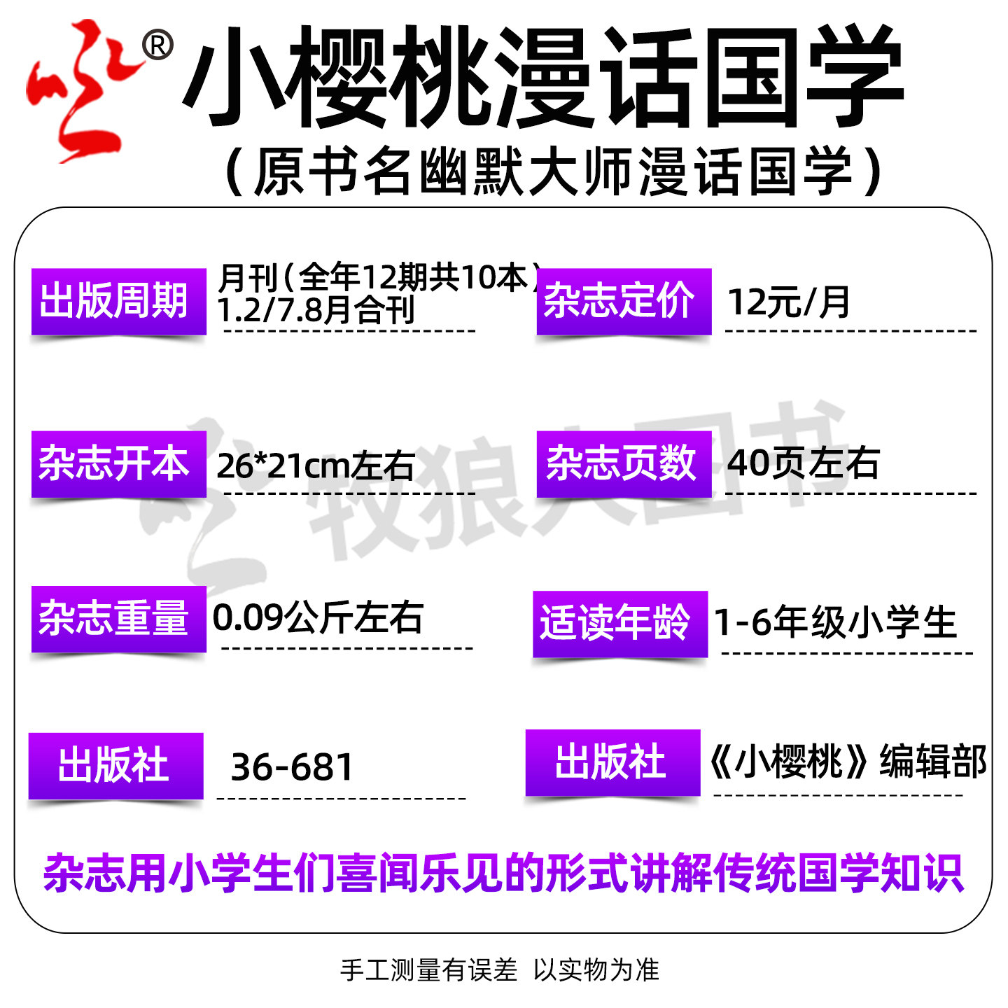 《小樱桃漫话国学》杂志2026年1-2月合刊(含2025年全年/半年订阅选项),专为7-12岁小学生打造,以幽默漫画形式讲述中华传统文化与历史故事。每期融合校园喜剧元素,让孩子在笑声中轻松学习国学经典、成语典故和古代智慧。内容生动有趣,画风活泼,兼具知识性与趣味性,是孩子课外阅读的理想选择。过刊期刊价格实惠,适合收藏或补订。通过“幽默大师”式表达,激发孩子对传统文化的兴趣,寓教于乐,助力语文素养与人文底蕴同步提升。