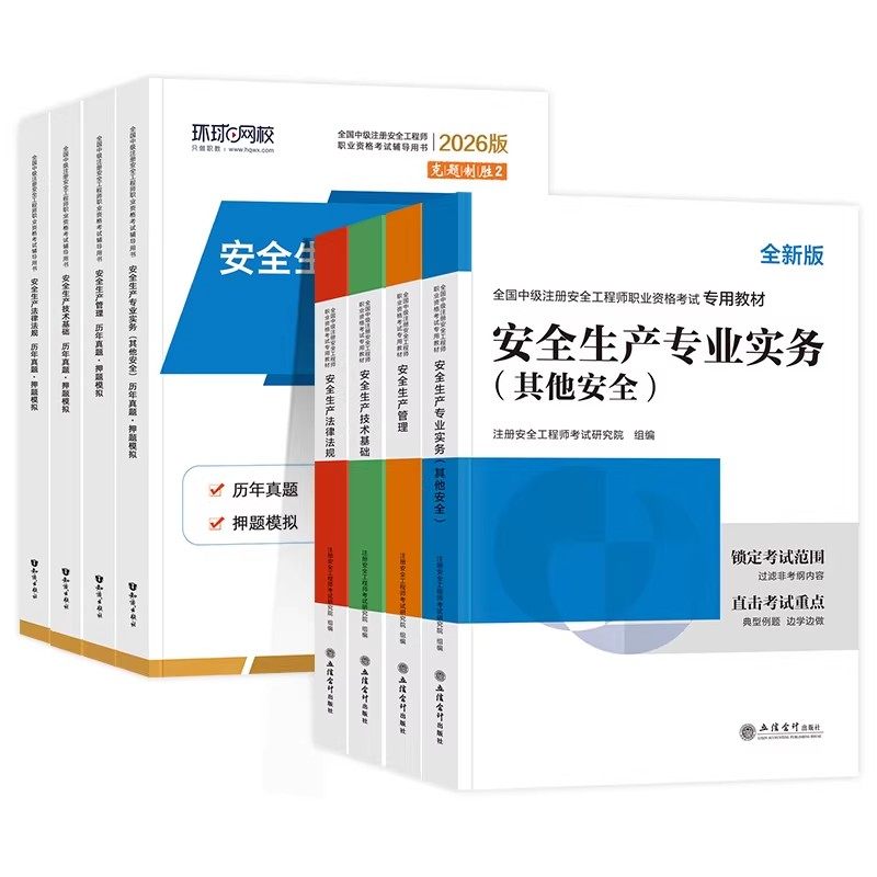 【赠26精讲】2026年新版中级注册安全工程师教材及配套资料重磅上线!涵盖建筑、化工、其他专业等全科目,包含历年真题、模拟试卷及精选习题,全面贴合最新考试大纲。由环球网校权威教研团队精心编撰,紧扣考点,助力高效备考。随书赠送应急管理出版社官方授权课程,含26节精讲视频,名师详解重难点,夯实基础、突破瓶颈。教材内容权威、结构清晰,习题典型实用,是考生通关中级注安考试的得力助手。一站式学习方案,助您一次拿证,赢在起点!