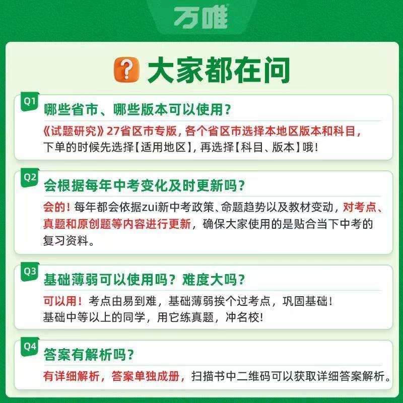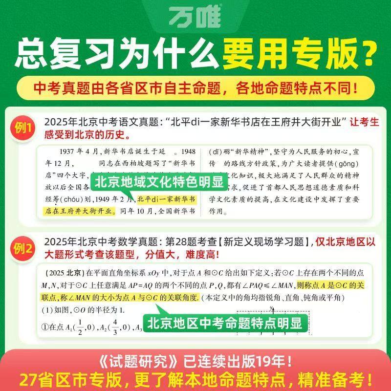 《2026万唯中考试题研究》是一套专为初三(九年级)学生设计的总复习资料,覆盖语文、数学、英语、物理、化学、生物、政治、地理、历史九大学科,精选广西、福建、安徽、贵州、湖北、江西等全国各省市近年中考真题及高质量模拟题。丛书紧扣最新考纲,深入分析命题趋势,系统梳理知识要点,强化重难点突破,注重解题方法与应试技巧训练。通过真题实战与模拟演练相结合,帮助学生夯实基础、提升综合能力,高效备战2026年中考。内容权威、结构清晰、针对性强,是广大师生复习备考的理想之选。