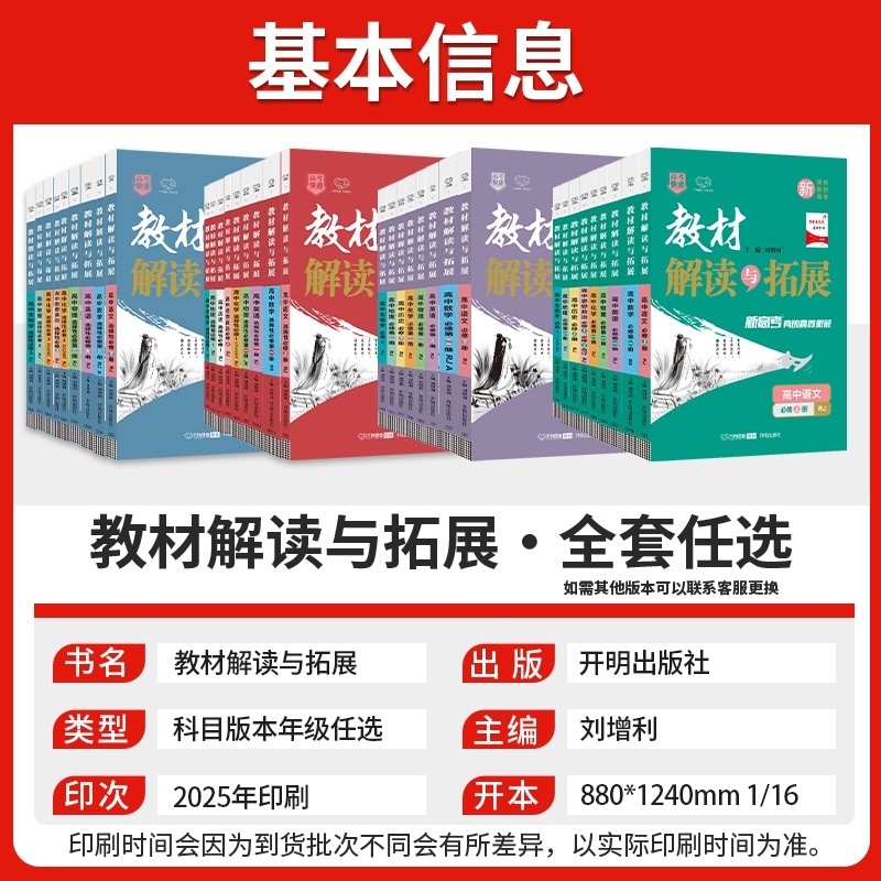 2026新版《教材解读与拓展》系列教辅,紧扣新课标与高考改革方向,涵盖高中语文、数学、英语、物理、化学、生物、政治、历史、地理九大学科,同步配套必修与选修第一至四册(上册),适用于高一、高二年级。本书由一线名师精心编写,深度解析教材知识点,突出重难点突破,融合经典例题与拓展提升训练,注重学科思维培养与核心素养提升。内容结构清晰,讲练结合,配有知识导图、易错辨析和真题链接,帮助学生夯实基础、拓展视野,是高效预习、复习与备考的理想辅导资料,助力学生全面提升学习效能。