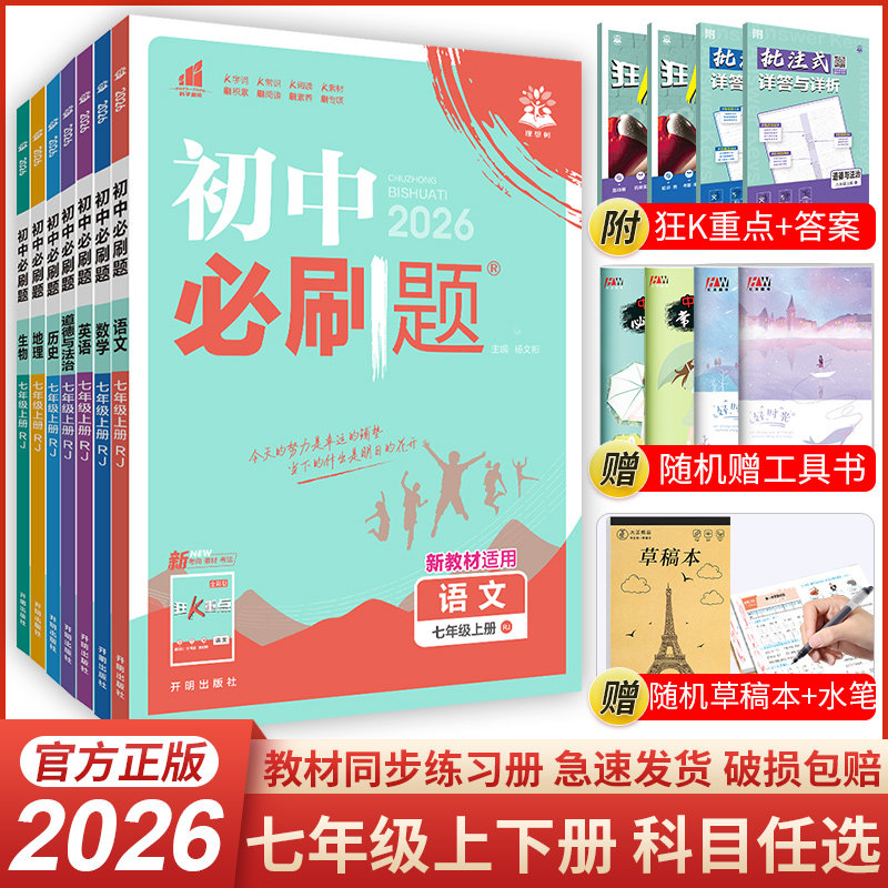 《2026初中必刷题》七年级上册下册(数学北师大版,语文、英语、政治、历史、地理、生物人教版)是一套专为初一学生设计的同步练习册与试卷全套,紧扣教材知识点,涵盖“小四门”及主科重点内容。题目分层设计,基础巩固、能力提升、拓展训练循序渐进,帮助学生夯实基础、突破难点。搭配“狂K重点”模块,提炼高频考点与易错题型,强化应试技巧。试卷形式贴近真实考试,便于自测与查漏补缺。本书注重知识整合与思维训练,是七年级学生高效复习、提升成绩的理想教辅资料,助力轻松应对期中期末及中考衔接。