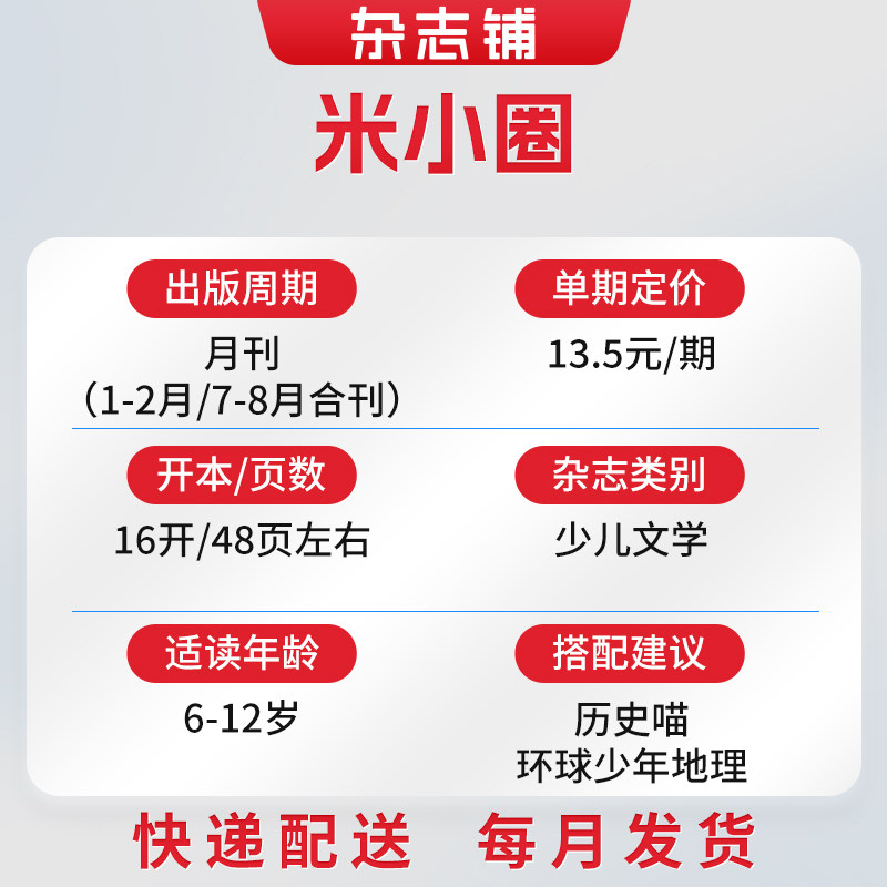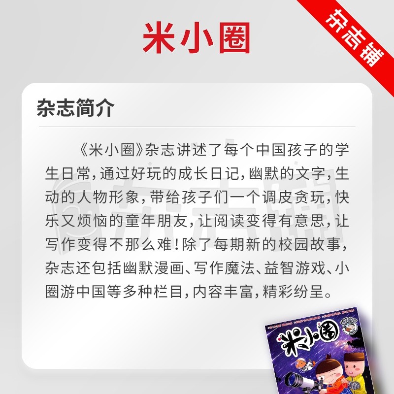 《米小圈上学记》杂志2026年1月起订,全年12期,专为6-12岁小学生打造,包邮到家!内容融合校园故事、趣味漫画、成语学习和成长日记,语言生动活泼,贴近孩子生活,深受1-6年级学生喜爱。每期通过米小圈的校园趣事,传递友情、勇气与智慧,寓教于乐,提升阅读兴趣与写作能力。作为畅销儿童读物,它不仅是一本杂志,更是孩子课外阅读的良伴。图文并茂,轻松有趣,帮助孩子在欢笑中积累知识、培养好习惯。现在订阅,全年精彩不断,让孩子爱上阅读,快乐成长!