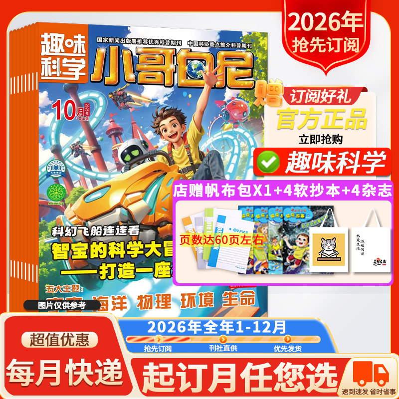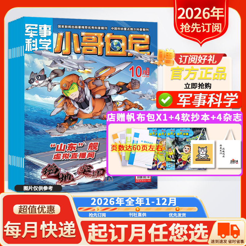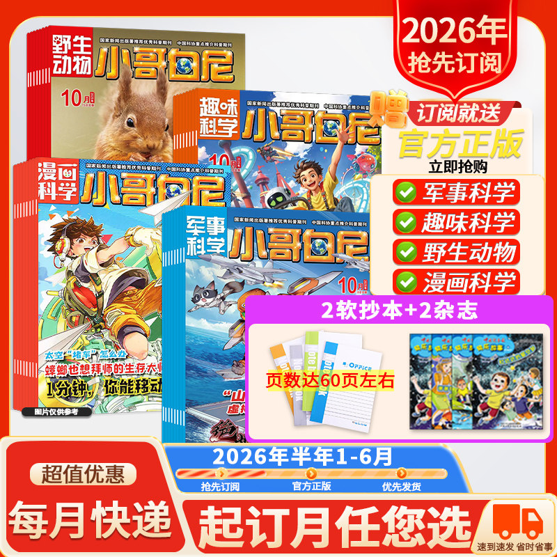 “店赠好礼!【小哥白尼杂志系列】2026年1-12月全年订阅火热开启!涵盖《军事科学》《趣味科学》《漫画科学》《野生动物》四大主题,专为青少年打造,内容生动有趣、知识丰富,融合前沿科技与趣味故事,激发孩子探索世界的热情。每期图文并茂,兼具科学性与可读性,助力培养科学思维与综合素养。现在订阅全年期刊,即享超值好礼相赠!无论是热爱军事、痴迷自然,还是钟情漫画与实验,总有一款适合你家小小科学家。寓教于乐,开阔视野,让知识在阅读中自然生长。立即抢购,开启一整年的科学奇遇之旅!”