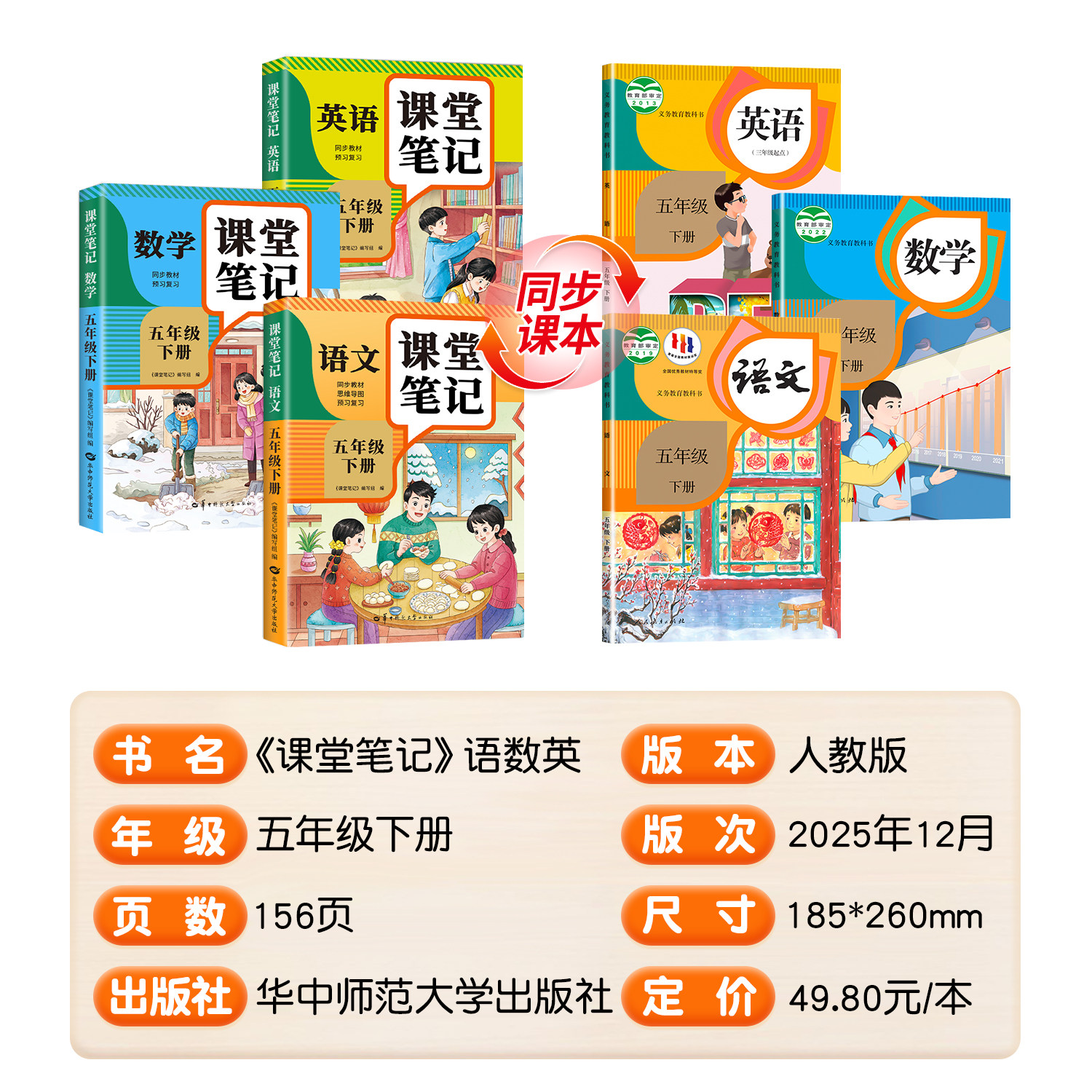 【2026新版】五年级下册课堂笔记(人教版)涵盖语文、数学、英语三科,紧扣新课标教材,专为小学五年级学生设计。本书融合黄冈学霸高效学习方法,系统梳理课本重点、难点与考点,配有清晰的知识框架、例题解析和同步练习,助力学生高效预习、复习与巩固。内容编排科学,图文并茂,语言通俗易懂,适合课堂同步学习与课后自主提升。正版保障,品质可靠,是家长辅导、学生自学的理想辅导资料,帮助孩子夯实基础、提升成绩,轻松应对学习挑战。