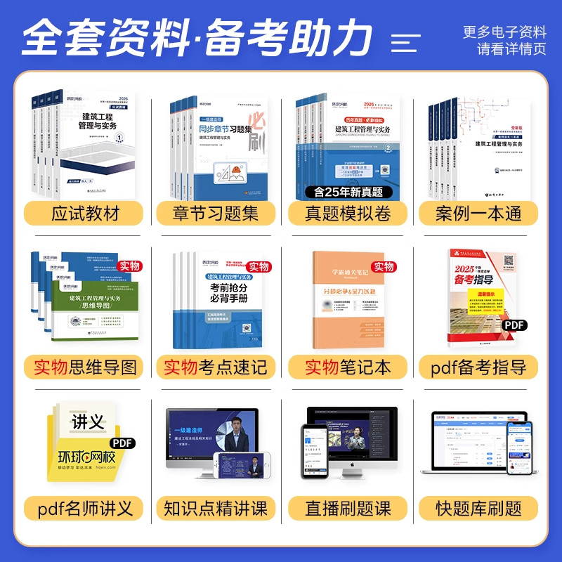 环球网校2026年一级建造师考试教材配套历年真题库及习题集,专为2025年考生精心打造,涵盖建筑、市政、机电、公路、水利等全科专业,融合法规、经济、项目管理核心内容。精选近十年官方真题,搭配高质量模拟题与四色重点笔记,突出高频考点与易错题型,助力高效刷题备考。习题解析详尽,紧扣最新考纲,强化知识理解与实战应用。无论是基础巩固还是冲刺提分,本题库均为一建考生不可或缺的权威复习资料,助您系统掌握考点,顺利通过2026年一级建造师考试。