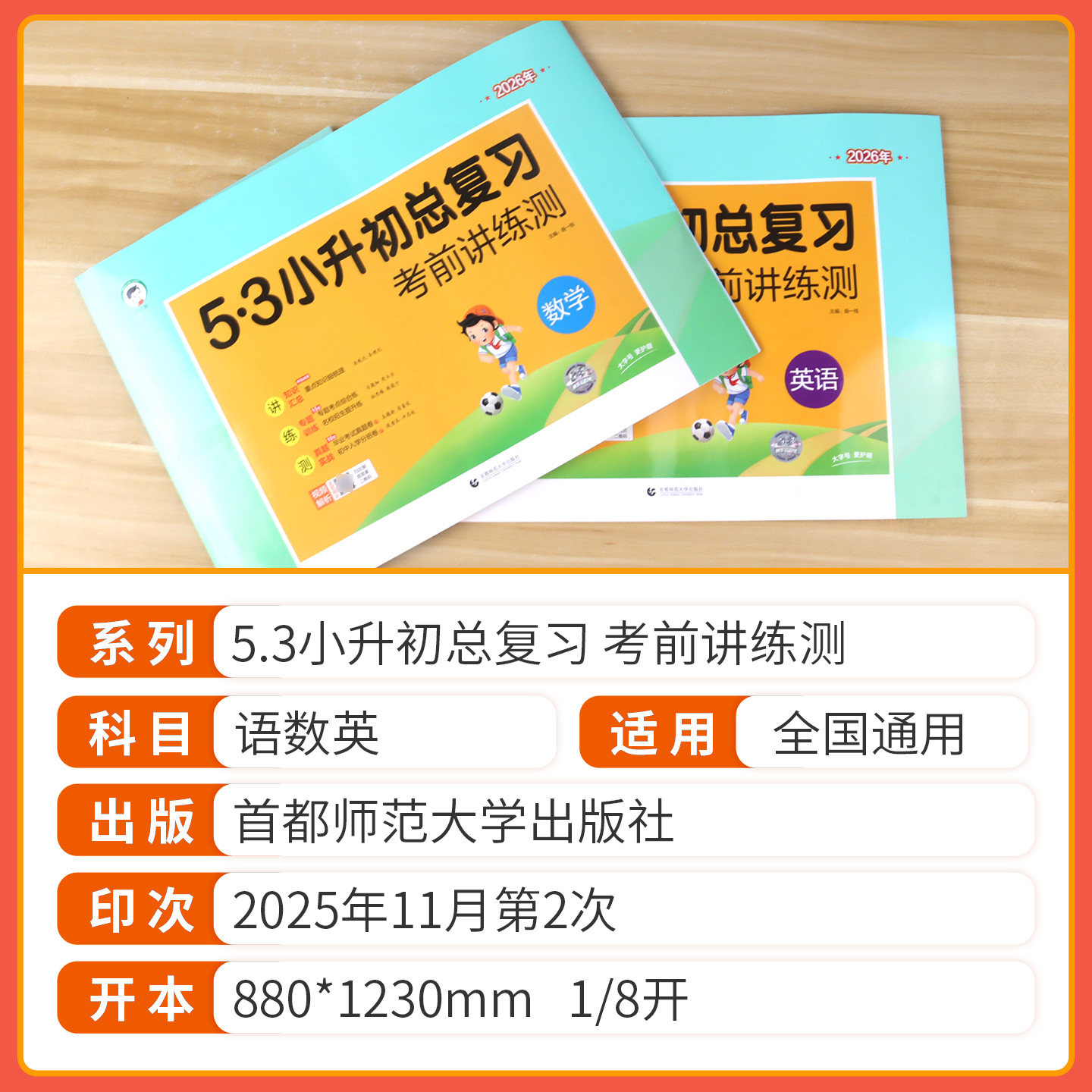 《2026年5.3小升初总复习考前讲练测》全国版+安徽专版,专为小学升初中学生打造,涵盖语文、数学、英语三科,紧扣新课标与考纲,精选全国及安徽本地历年真题与名校模拟题。丛书采用“讲—练—测”三位一体模式,系统梳理知识点,强化专项训练,突出重难点突破,助力学生高效备考。全国版立足通用考点,安徽专版结合本地命题特色,精准对接升学考试。配套真题卷与模拟试卷,全面检测学习成果,提升应试能力。五三品牌权威可靠,是广大小升初考生冲刺名校、决胜考场的必备刷题利器。