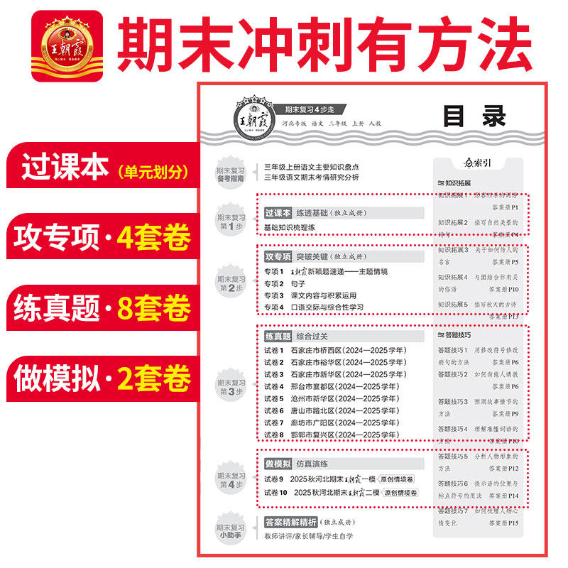 2025秋新版上册《王朝霞各地期末试卷精选》河北专版,专为三年级学生设计,涵盖语文、数学、英语三科,同步冀教版、人教版教材。试卷精选河北省各地优质期末真题,紧扣新课标要求,题型丰富、难度适中,全面检测学习成果。每套试卷均配有详细答案解析,帮助学生查漏补缺,提升应试能力。本书注重基础知识巩固与综合能力培养,适合期末复习、阶段自测和考前冲刺使用。无论是课堂练习还是家庭作业,都能有效助力学生夯实基础、稳步提分,是三年级学生高效复习的理想选择。