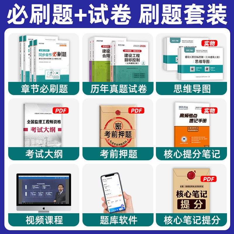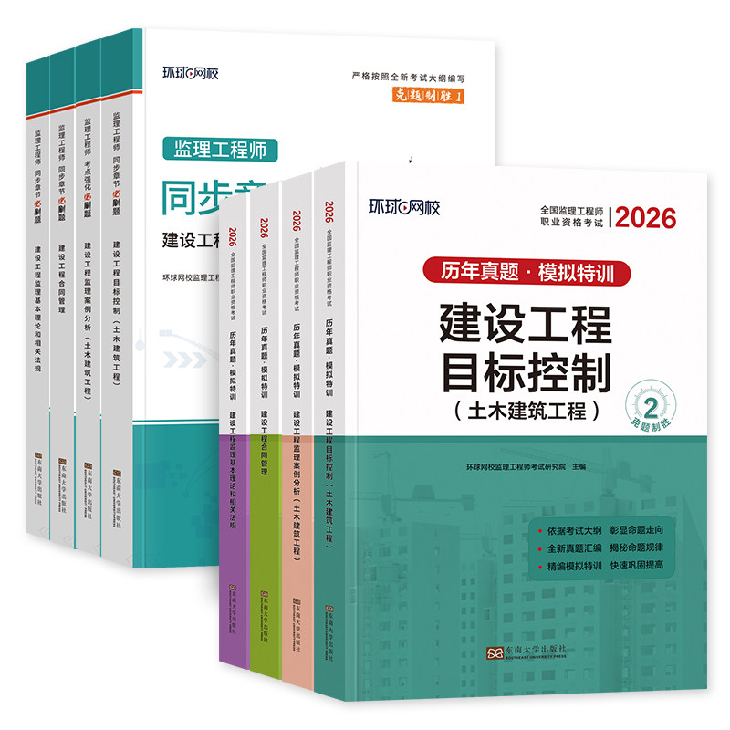 环球网校2026年监理注册工程师考试辅导资料,涵盖土建、水利、交通、房建等专业方向,提供历年真题试卷、全套章节习题集、必刷题及押题密卷,全面贴合国家监理工程师考试大纲。资料包含《建设工程合同管理》《建设工程监理基本理论》《建设工程目标控制》(三控)及《建设工程监理案例分析》四大核心科目,紧扣最新教材与命题趋势。通过系统化练习与高频考点精讲,帮助考生夯实基础、突破重难点,提升应试能力。环球网校凭借多年教研经验,精准把握考试方向,是广大考生高效备考、顺利通过监理工程师考试的权威学习工具。