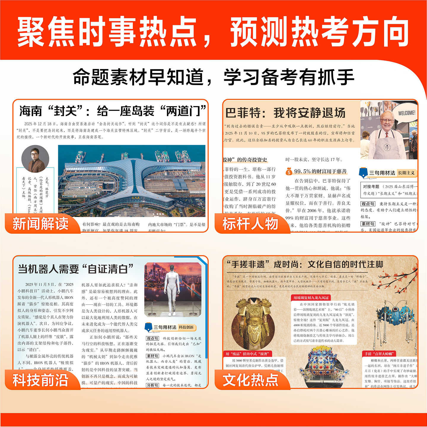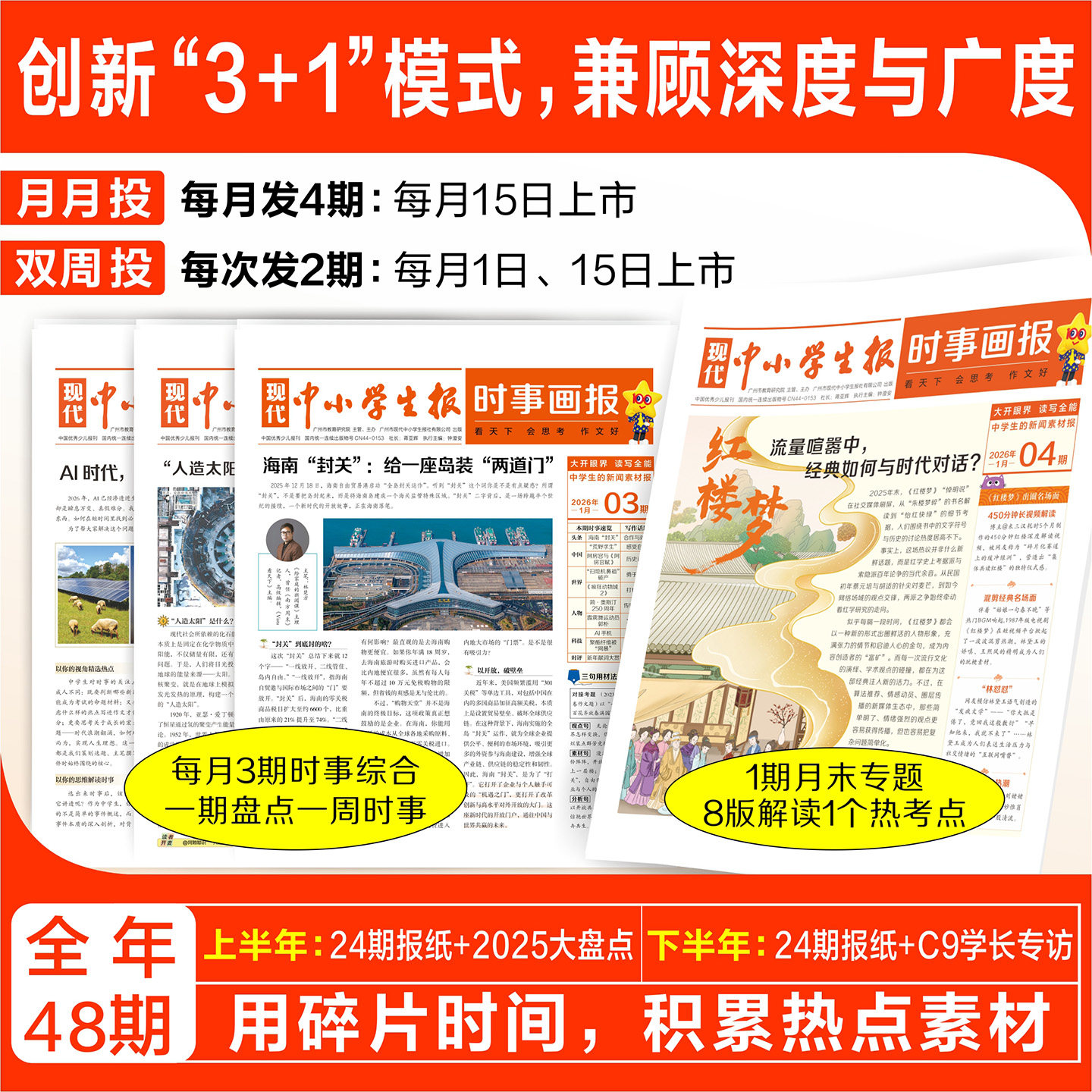 天星教育《2026春季高中时事画报·新闻素材报》(高中版)专为高一二三学生打造,聚焦国内外热点时政新闻,精选权威、鲜活的时文素材,涵盖科技、社会、文化、生态等多领域。报纸以图文并茂的形式呈现,语言简洁生动,兼具思想性与可读性,助力学生拓宽视野、提升思辨能力。每期设置“热点聚焦”“时文赏读”“素材积累”等栏目,紧扣高考作文命题趋势,提供丰富写作素材与立意角度,是中学生积累语文作文素材、提升阅读素养的优质辅助读物,助力学子在学业与成长中把握时代脉搏。
