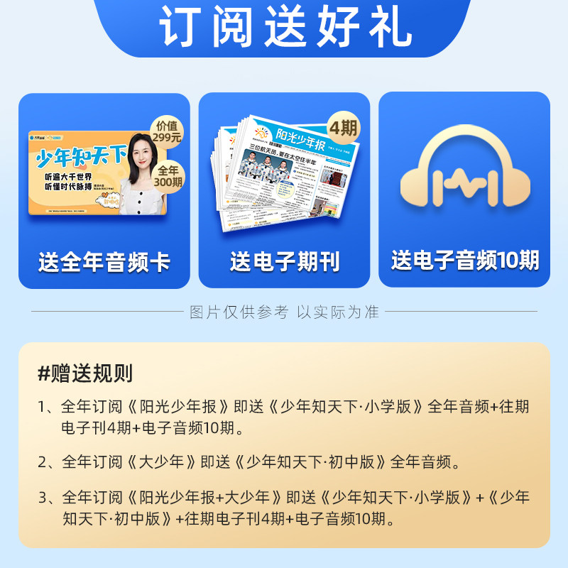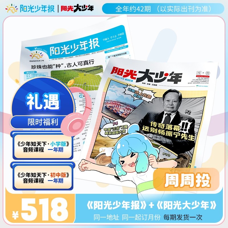 《阳光少年报》2026年1月全新推出全年订阅服务,附赠全年音频内容,让阅读更生动!专为小学和初中学生打造,分为“大少年小学版”和“初中版”,内容贴近青少年成长,涵盖时事热点、科学探索、人文历史与品德教育。2025年秋冬合订本现已上线,精选优质文章,便于回顾与收藏。特别推出“大少年哪吒专题”,以青少年视角解读传统文化,激发阅读兴趣。作为少年报官方旗舰杂志,坚持正能量导向,语言生动、图文并茂,是陪伴孩子健康成长的良师益友。订阅即享全年精彩内容,助力阳光少年全面发展。