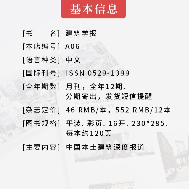 《建筑学报》是中国建筑学会主办的权威学术期刊,创刊于1954年,致力于传播建筑理论、设计实践与学术前沿。本刊涵盖建筑设计、城市研究、建筑历史、技术革新及建筑文化等多领域内容,汇聚国内外优秀建筑作品与深度评论。现提供2022年至2026年各年度全年12期订购服务,支持按年订阅或单期选购,满足不同读者需求。同时,我们还精选优质《建筑设计》《建筑艺术》等期刊杂志,内容兼具学术性与艺术性,适合建筑师、学者、学生及建筑爱好者收藏阅读。欢迎订阅,共探建筑之美与智慧。