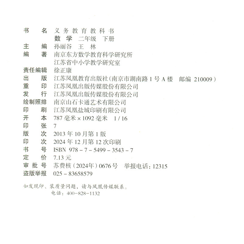 苏教版二年级下册小学数学课本,是依据国家义务教育课程标准编写的小学数学教材,适用于小学二年级下学期学生使用。本书由江苏教育出版社出版,内容编排科学合理,注重基础知识的巩固与思维能力的培养。教材通过生动有趣的情境图、贴近生活的问题和丰富的实践活动,帮助学生理解加减法、乘除法初步、图形认识、长度单位等核心数学概念。语言通俗易懂,练习设计层次分明,兼顾趣味性与实用性,有效激发学生学习兴趣。作为新华书店正版教材,本书印刷清晰、质量可靠,是学生系统学习数学、夯实基础的重要工具书,深受师生和家长信赖。