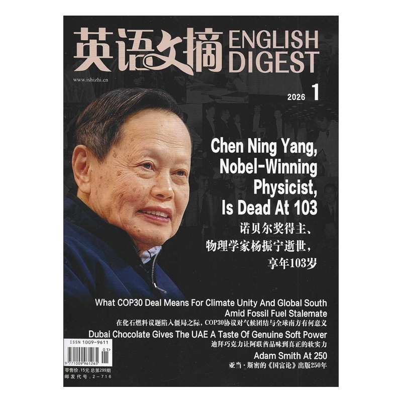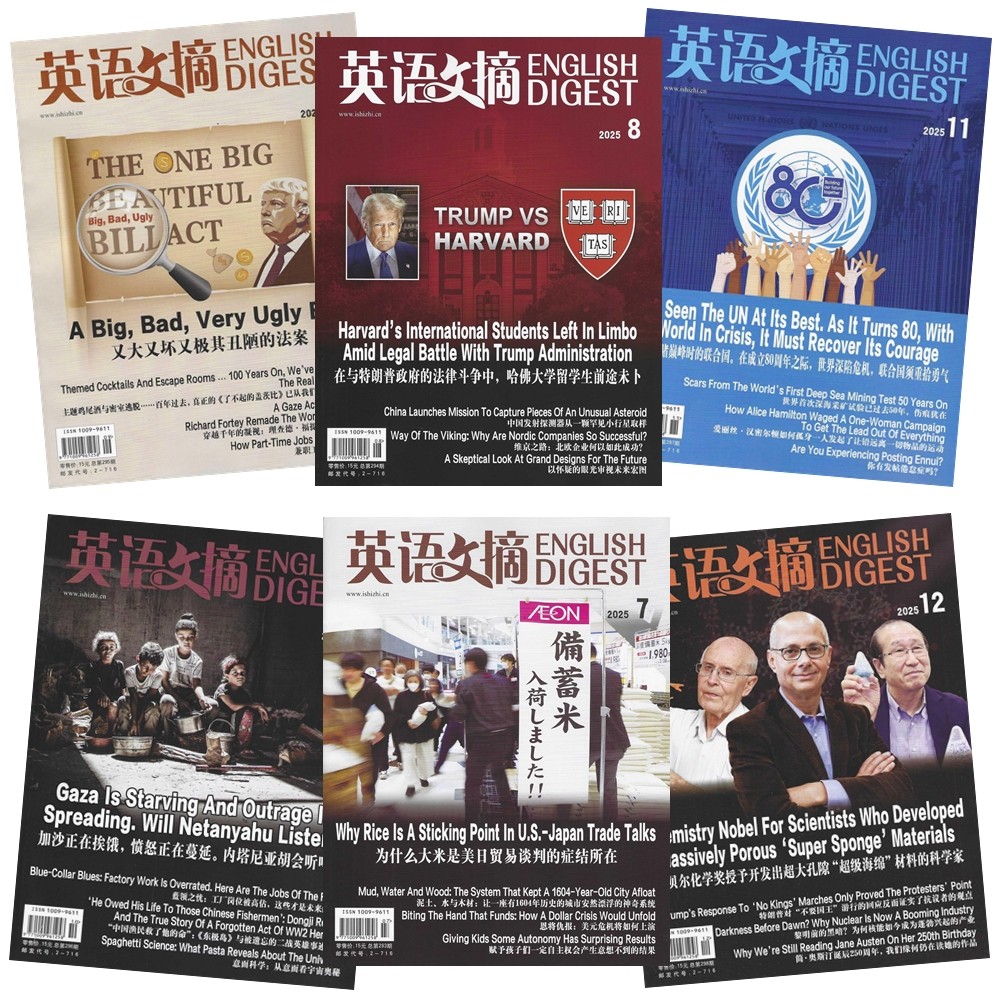 《ENGLISHDIGEST英语文摘》2026年1-6月刊(共6期)现推出过刊清仓特惠订阅!本刊为权威双语时事财经人物新闻月刊,邮发代号2-716,精选全球热点资讯,涵盖经济、科技、文化等领域。每期提供英汉对照优质译文,助力提升英语阅读与理解能力。随刊赠送配套音频,支持听力训练,实现“读+听”双效学习。内容权威、语言地道,适合英语学习者、职场人士及考研群体。现超值清仓,机会难得,欢迎订阅!通过邮局或官方渠道即可订购,轻松获取高质量英语学习资源。