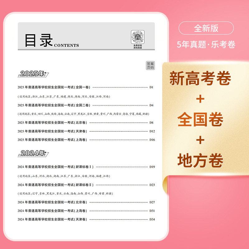 《2026乐考卷·五年高考真题卷》专为新高考生打造,精选2021—2025年全国卷及地方卷高考真题,涵盖语文、数学、英语、物理、化学、生物、政治、历史、地理等文理全科目。试卷严格依据新课标和高考评价体系编排,题型、难度贴近最新高考趋势,助力考生精准把握命题方向。每套真题均附详细解析,点拨解题思路,强化应试技巧。本书系统梳理五年高频考点,帮助考生查漏补缺、高效复习,是备战2026年高考的权威真题训练资料,适合一轮夯实基础、二轮提升能力使用,全面提升综合应试水平。