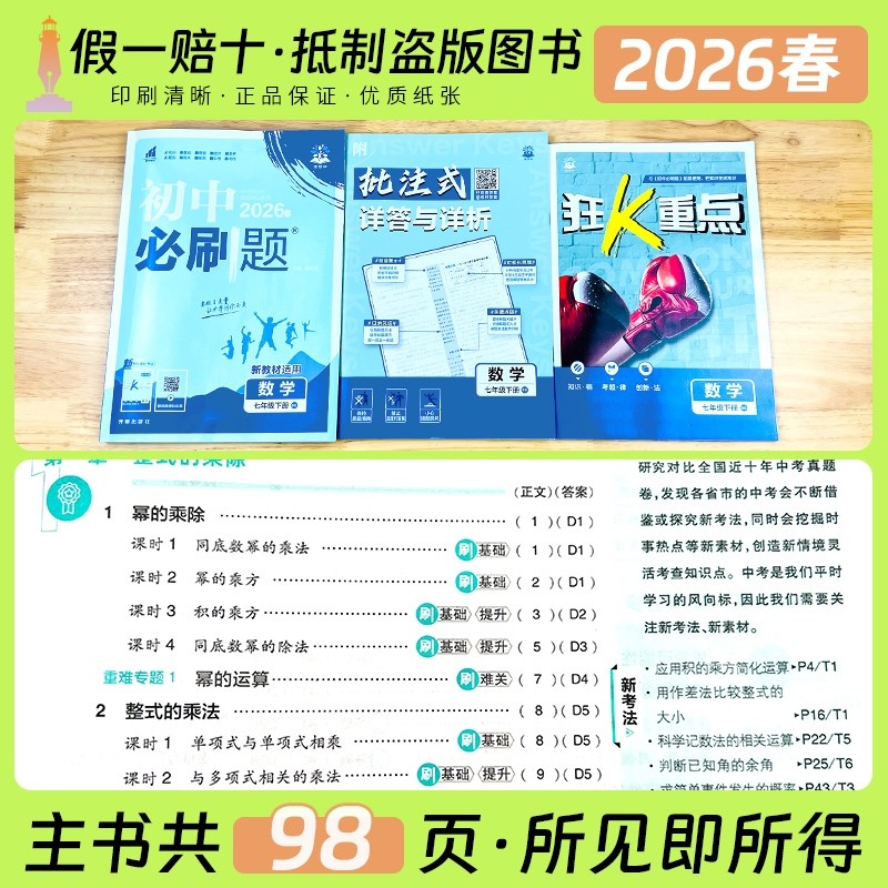 2026版《初中必刷题》是一套专为七至九年级学生打造的全科同步练习资料,涵盖语文、数学、英语、物理、化学、生物、地理、历史、道德与法治等学科,适配人教版、北师大版、华师大版等多种教材版本。题目紧扣新课标要求,分层设计基础巩固、能力提升与中考真题模拟,帮助学生夯实基础、突破重点难点。书中精选典型例题,附详细解析与思路点拨,强化知识运用能力。同时设置“狂K重点”专题,系统梳理核心考点,提升学习效率。适合课前预习、课后复习及阶段性检测,是初中生高效提分的优质教辅资料。