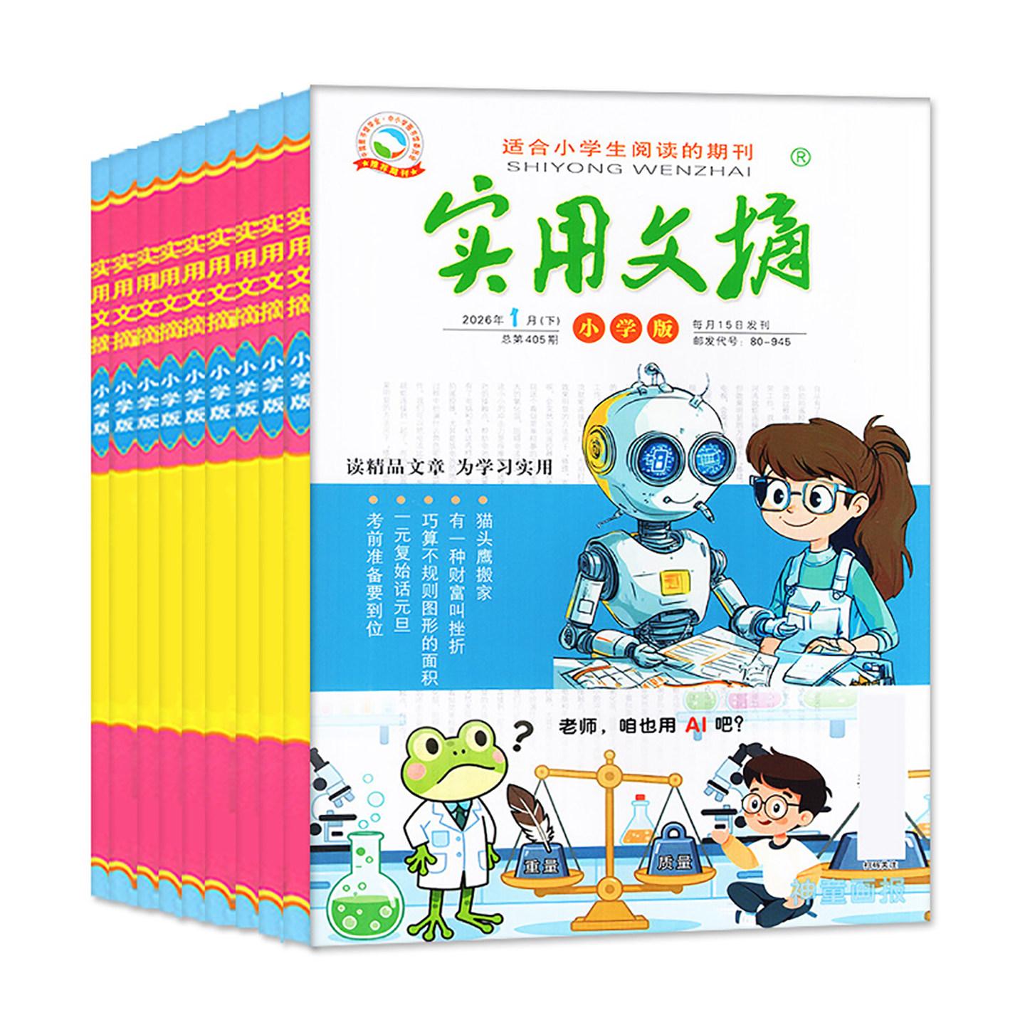 《实用文摘小学版》2026年1月上下新刊,专为小学中高年级学生精心打造,内容涵盖优质作文素材、课外拓展知识与趣味阅读,助力语文素养提升。本期延续杂志一贯的实用性与可读性,精选同龄佳作、名家美文及热点话题,拓宽视野,激发写作灵感。升级为更大开本,排版清晰,图文并茂,阅读体验更佳。同时推出全年/半年订阅选项,并特别纪念15周年推出ABCD珍藏套装。2025年全年过刊同步供应,性价比高,适合积累素材、巩固学习。无论是日常阅读还是作文备考,都是小学生不可多得的优质课外读物。