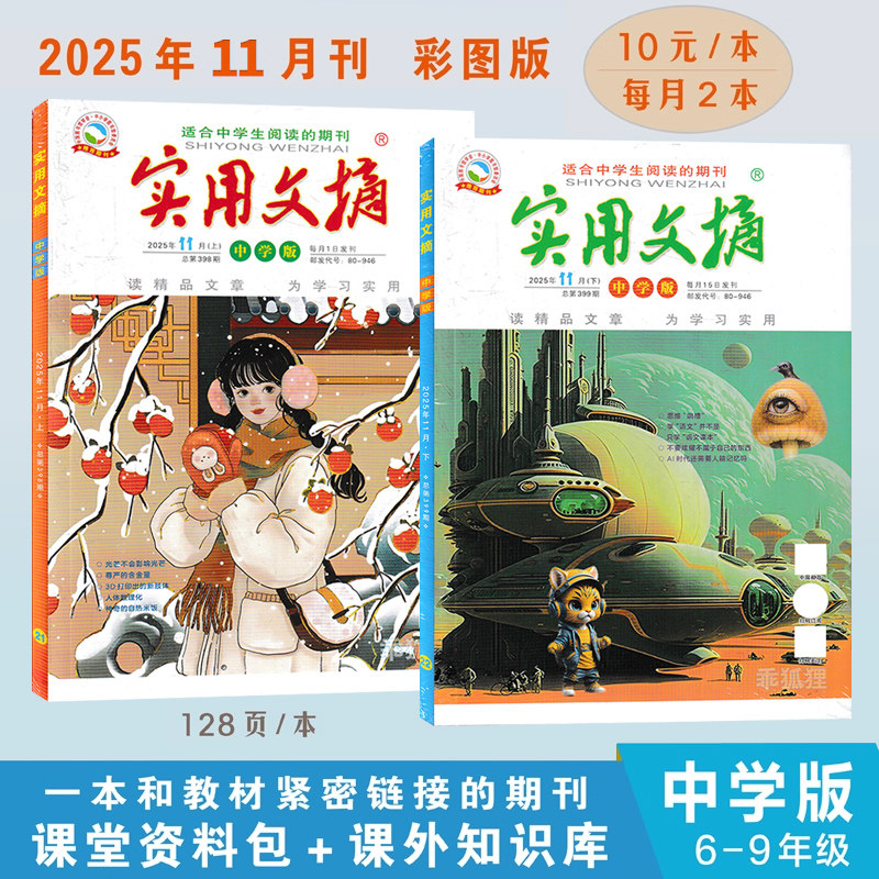 【套餐可选】《实用文摘中学版》2026年1月新刊现货发售,专为初中生精心打造的课外阅读期刊。内容涵盖语文学习、作文素材、时事热点与人文知识,语言生动、题材丰富,紧扣中学语文课程标准,助力提升阅读能力与写作水平。每期精选优质文章,拓展视野,激发思考,是课堂学习的优质补充。现推出全年订阅套餐,多期可选,优惠便捷,适合青少年自主学习。无论是积累素材、提升语感,还是备战中考,都是理想之选。少年阅读,从《实用文摘》开始,让知识更实用,让成长更精彩!
