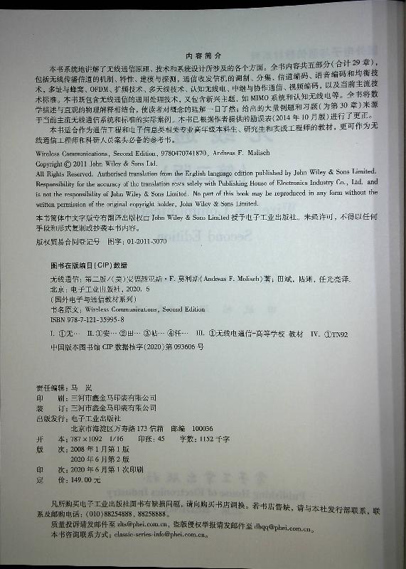 《无线通信(第二版)》系统阐述了无线通信的基本原理、关键技术与系统设计方法,涵盖调制解调、信道编码、多址接入及抗干扰等核心技术。本书结合主流无线通信系统(如4G/5G、Wi-Fi、蓝牙)与标准,提供丰富的实际案例分析,帮助读者深入理解理论应用。特别聚焦MIMO(多输入多输出)系统,详解其提升频谱效率与传输可靠性的机制;同时引入认知无线电技术,探讨其在动态频谱接入与资源优化中的前沿应用。作为官方旗舰店推荐教材,本书兼顾理论深度与实践指导,适合通信工程专业学生、研究人员及工程技术人员学习与参考,是掌握现代无线通信系统的权威指南。