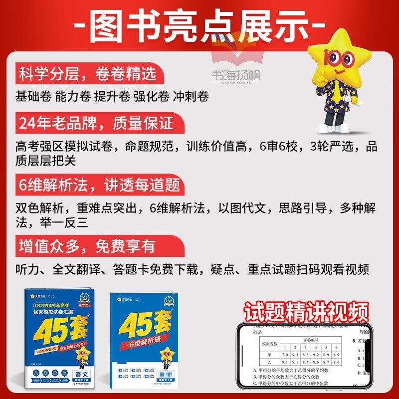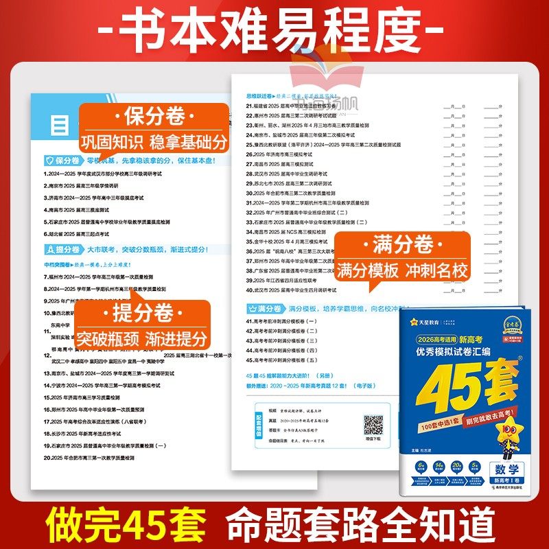 《湖南高考2026版金考卷45套》是天星教育专为2025届高三学子打造的高考总复习权威资料,涵盖数学、英语、语文、物理、化学、生物、政治、历史、地理九大学科。精选近年全国及各省市优质模拟题与真题,科学编排为45套高质量仿真试卷,契合湖南新高考命题趋势。试卷结构严谨,难度梯度合理,适用于一轮夯实基础、二轮专题突破及冲刺模拟训练。每套试题均附详细解析,助力考生查漏补缺、提升应试能力。该书紧扣新课标与考纲,是高三复习备考的高效利器,广受师生信赖与推荐。