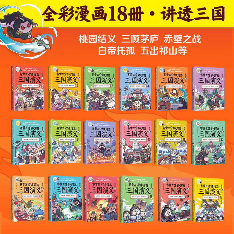 【礼盒装+群英卡*144】赛雷三分钟漫画《三国演义》1-18册全套,是一套专为青少年打造的正版历史漫画丛书。以生动有趣的漫画形式,将《三国演义》经典故事浓缩在“三分钟”内,让孩子轻松读懂四大名著之一。全套18册涵盖桃园结义、赤壁之战、三顾茅庐等精彩篇章,语言幽默、画风精美,兼具知识性与趣味性。礼盒装设计精美,适合收藏或送礼。附赠144张群英卡,收录三国英雄人物,增强互动与记忆。适合6岁以上儿童阅读,是培养历史兴趣、提升阅读能力的优质选择,让孩子在快乐中走进波澜壮阔的三国时代。