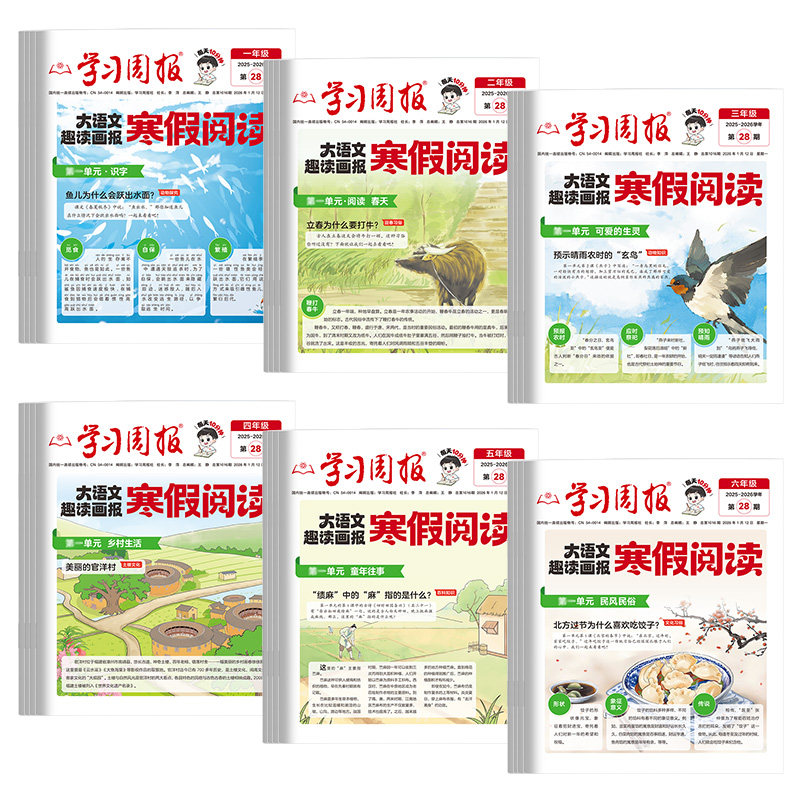 2026新版《寒假阅读趣读大语文知识画报》专为小学一至六年级学生设计,是寒假期间衔接新年级、拓展语文素养的优质学习资源。该画报融合同步教材知识点,涵盖字词句、古诗文、阅读理解与写作技巧等基础内容,结合趣味故事、文化常识和课外拓展,激发孩子阅读兴趣。每期以图文并茂的形式呈现,兼顾知识性与趣味性,帮助学生在假期巩固所学、提升语文综合能力。作为一本集期刊与报纸优势于一体的综合性读物,它既是寒假自主学习的好帮手,也是衔接新学期课程的理想桥梁,助力孩子轻松领跑新学期。