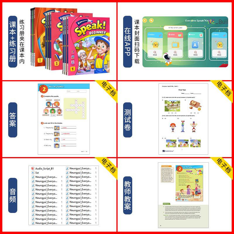 《Everyone Speak Kids Beginner》是专为少儿英语启蒙设计的口语教材,适合小学低年级学生使用,紧密对接剑桥少儿英语YLE Starters及KET考试要求。教材以趣味互动为核心,通过生动的情景对话、朗朗上口的儿歌和丰富的课堂活动,帮助孩子在真实语境中自然习得基础词汇与日常表达。内容由浅入深,注重听说能力培养,同时融入自然拼读与基础语法,全面提升语言综合素养。配套音频纯正地道,支持沉浸式学习,助力孩子建立英语自信,轻松应对国际测评,是少儿英语口语教学的优质选择。