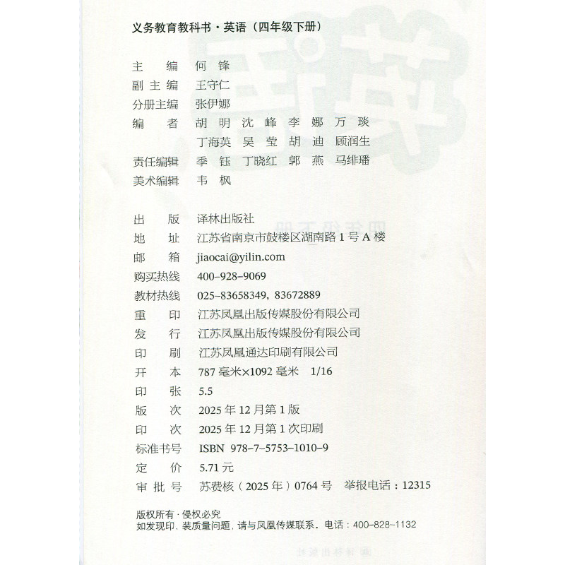 译林版四年级下册英语课本(三年级起点)是依据国家义务教育课程标准编写的小学英语教材,适用于小学四年级学生。本书内容贴近儿童生活,注重听说读写综合语言能力的培养,通过生动有趣的对话、歌曲和活动,激发学生学习英语的兴趣。教材结构清晰,单元主题丰富,涵盖日常交流、校园生活、节日文化等方面,循序渐进地提升学生的语言运用能力。配套插图精美,语言地道,符合小学生的认知特点。作为新华书店正版教材,本书权威可靠,是教师教学和学生学习的重要依据,助力学生在轻松愉快的氛围中打好英语基础。