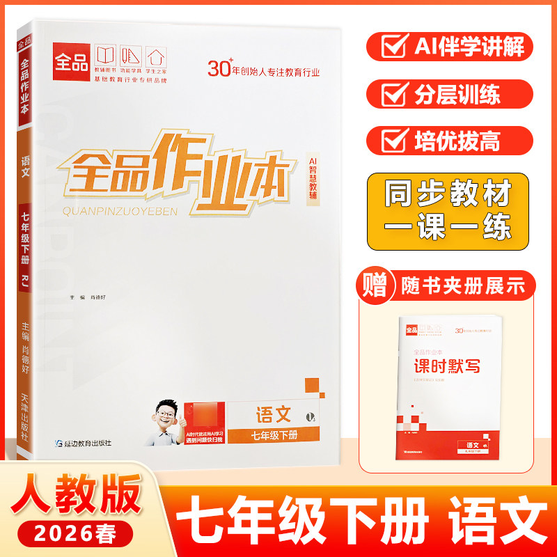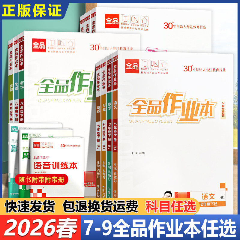2026春新版《全品作业本》七八九年级下册,涵盖语文、数学、英语、物理、化学、生物、地理、历史、道德与法治九大学科,紧扣人教版初中教材,同步课时训练,精选典型例题,强化基础知识与能力提升。题目设计由浅入深,兼顾基础巩固与培优拓展,配有详细解析,助力学生高效自学与查漏补缺。本书注重知识体系构建与学科素养培养,是初中生课后练习、考前复习的理想教辅资料。全品作业本以“必刷题+同步培优”为核心,帮助学生夯实基础、提升成绩,助力中考备考。