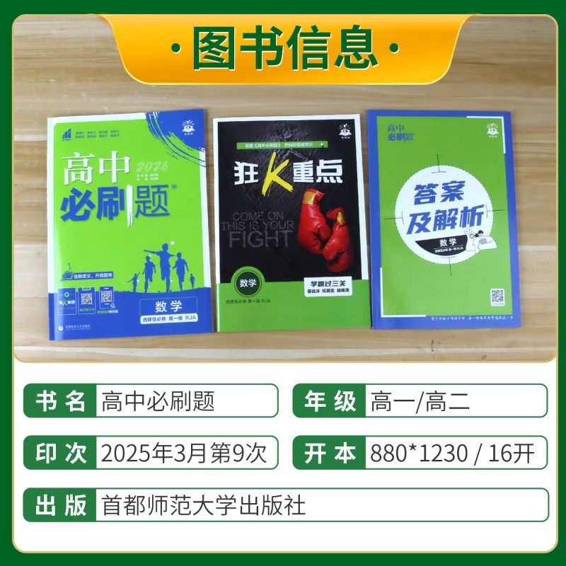 《高中必刷题》系列由新华书店出版,专为2026届高一学生打造,涵盖数学、物理、化学(人教版必修上册)及语文、英语、政治、历史、地理(下册)等科目,同步教材内容,夯实基础。丛书结合“狂K重点”特色,提炼核心考点,精选典型例题,分层训练,助力学生高效掌握重难点。理科部分采用鲁科版选修一内容,注重思维拓展与高考衔接;文科强化基础知识与阅读理解能力。题目设计贴近高考命题趋势,讲练结合,适合课堂同步学习与课后巩固提升,是高中生夯实基础、冲刺高考的理想教辅资料。