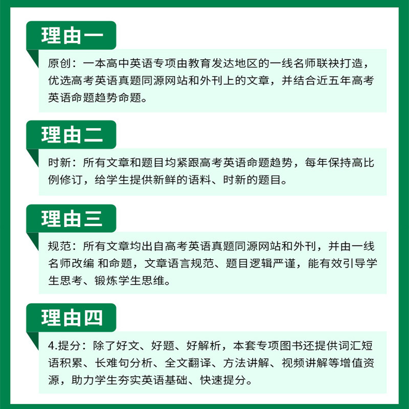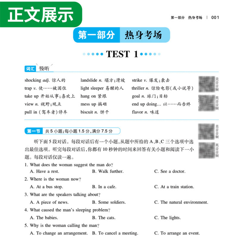 《2026一本高中英语听力模拟考场》专为新高考设计,涵盖高一至高三全阶段,同步教材进度,提供系统化的听力专项训练。本书精选贴近高考真题的模拟题,题型全面,难度分层,兼顾课内巩固与课外拓展,帮助学生在真实语境中提升听力理解能力。每套练习均配有标准听力原文与详细答案解析,便于自查自纠。音频材料发音标准、语速适中,覆盖日常对话、校园生活、社会热点等高频话题,有效强化应试技巧与语言感知力。适合高中生日常训练、考前冲刺及教师课堂使用,是突破听力瓶颈、提升英语综合素养的理想辅助资料。