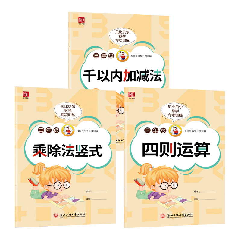 《贝比贝尔数学专项三年级上册/下册》是一本专为小学三年级学生设计的数学强化训练本,聚焦1000以内百位数的加减法、乘除法运算。本书系统编排竖式计算、口算练习及四则混合运算题目,题型丰富、梯度合理,帮助学生夯实计算基础,提升运算速度和准确性。通过专项训练,学生能熟练掌握进位退位、乘法口诀应用及混合运算顺序,有效巩固课堂所学。书中题目贴近教材,配有清晰格式示范,适合课后练习、家庭辅导或考前复习,是提升三年级学生数学计算能力的实用工具书。