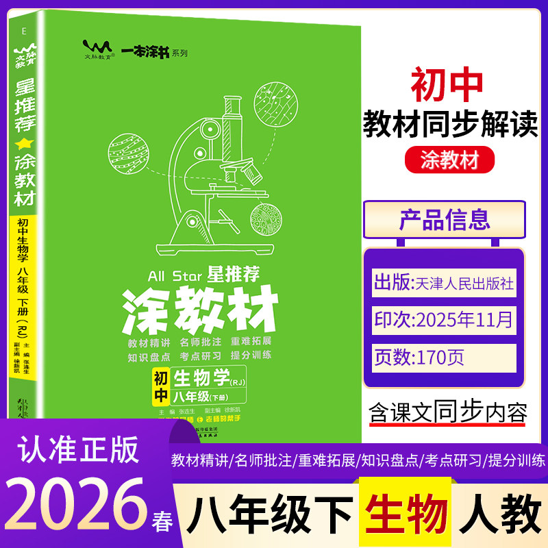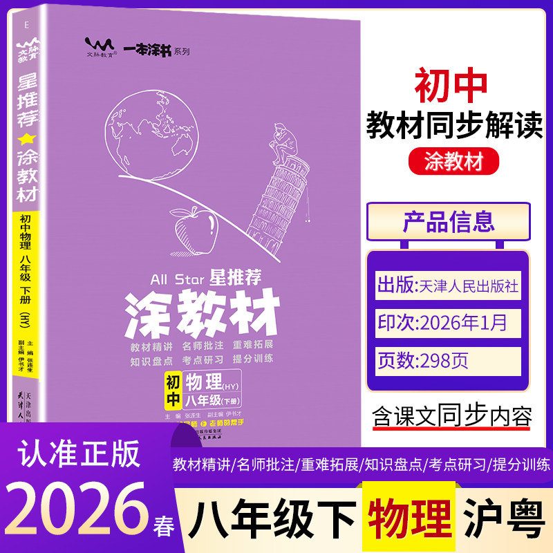 《2026春·涂教材》八年级上下册教辅资料,涵盖数学、英语、语文、物理、生物、政治、历史、地理全学科,紧扣最新教材版本,系统梳理各章节核心知识点,重难点突出,讲解深入浅出。书中配有典型例题解析与同步练习题,帮助学生夯实基础、提升解题能力。每节内容均设置知识框架、要点精讲与易错警示,便于课前预习、课堂同步学习与课后复习。题型设计贴近中考趋势,强化知识迁移与应用能力。全彩印刷,图文并茂,学习体验更佳。是八年级学生高效掌握教材内容、提升综合素养的理想辅导用书。