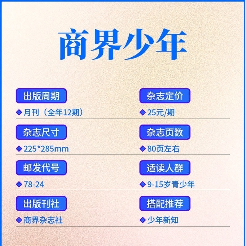 《商界少年》2026年1月现货,现推出全年/半年订阅服务,专为9-15岁中小学生打造,致力于培养青少年财商素养与商业思维。杂志融合趣味故事、真实案例与实用知识,引导孩子理性消费、规划未来,成就阳光少年。同时推出2025年1-12月过刊礼盒珍藏版,精选《好奇号》《万物》等优质科普内容,搭配《阳光少年报》时事精华,知识丰富、设计精美,适合收藏与反复阅读。无论是提升综合素养,还是启发创新思维,这套礼盒都是家长馈赠孩子的理想之选,助力青少年在成长路上开阔视野、自信前行。
