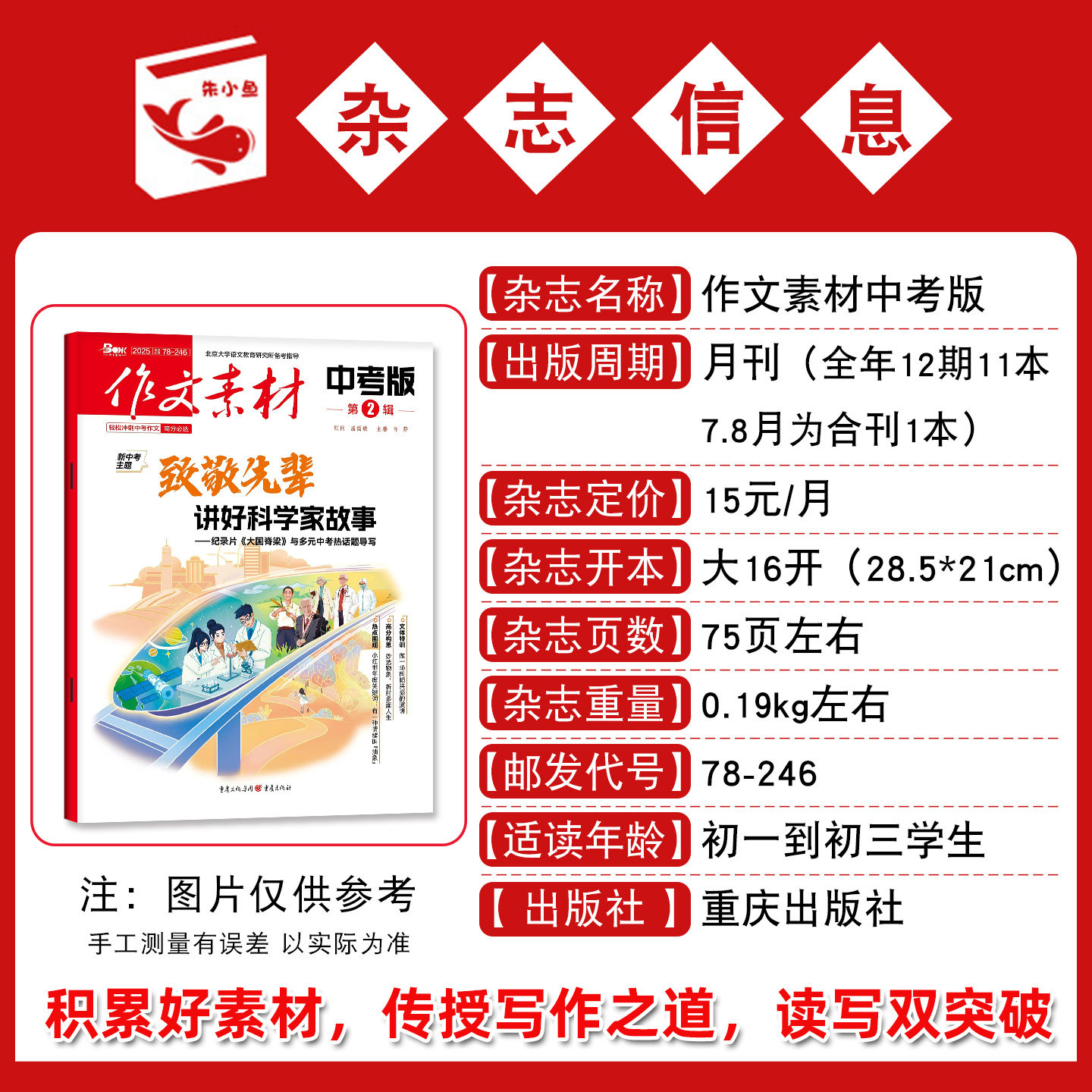 《作文素材·中考版》2026年1/2月合刊专为初中生打造,精选全年热点话题、经典美文与考场范文,助力中考写作提分。内容涵盖时事热点、人物故事、哲理思辨及优秀习作点评,语言鲜活、素材新颖,兼具思想性与实用性。合辑融合《课堂内外》《创新作文》《实用文摘》等优质资源,浓缩精华,便于积累与仿写。无论是全年订阅、半年订阅,还是2025年过刊回顾,均为初中生提供系统、高效的写作素材库,帮助学生在阅读中拓宽视野,在积累中提升表达,是备战中考的理想读写伴侣。
